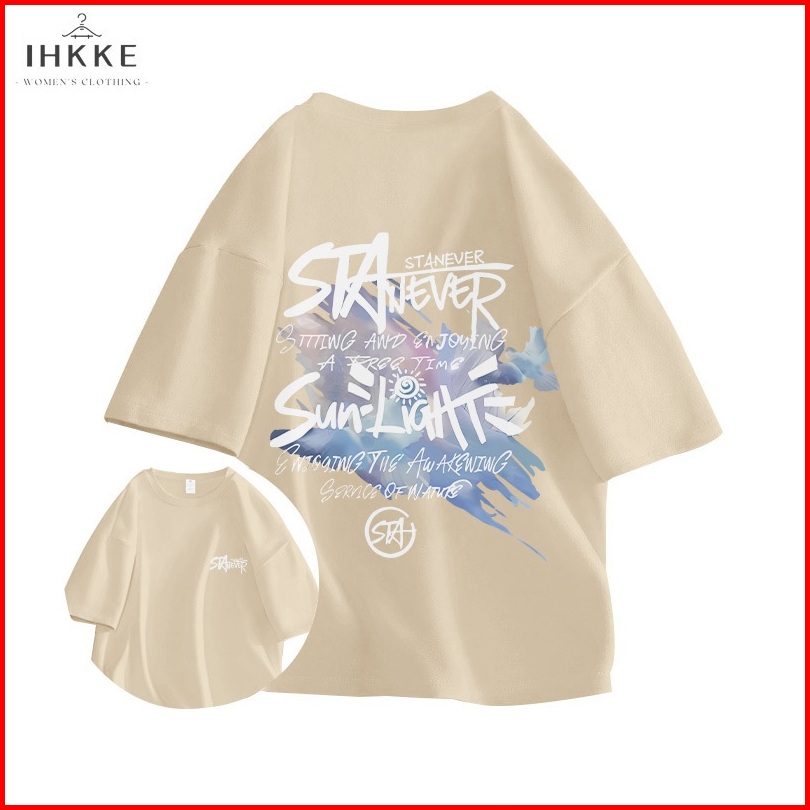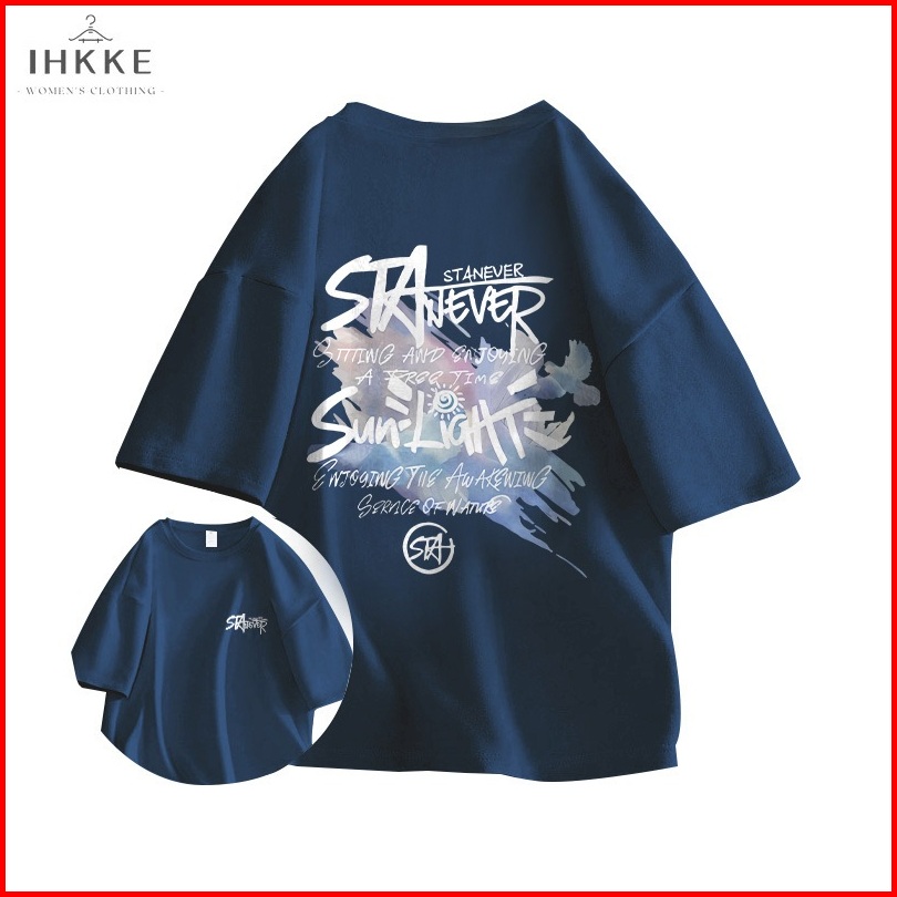 Ihkke Baju Atasan Wanita Cetakan Grafiti Trendi Biru Laut T-shirt Baju Atasan Wanita Terbaru Lengan Pendek Tebal Atasan