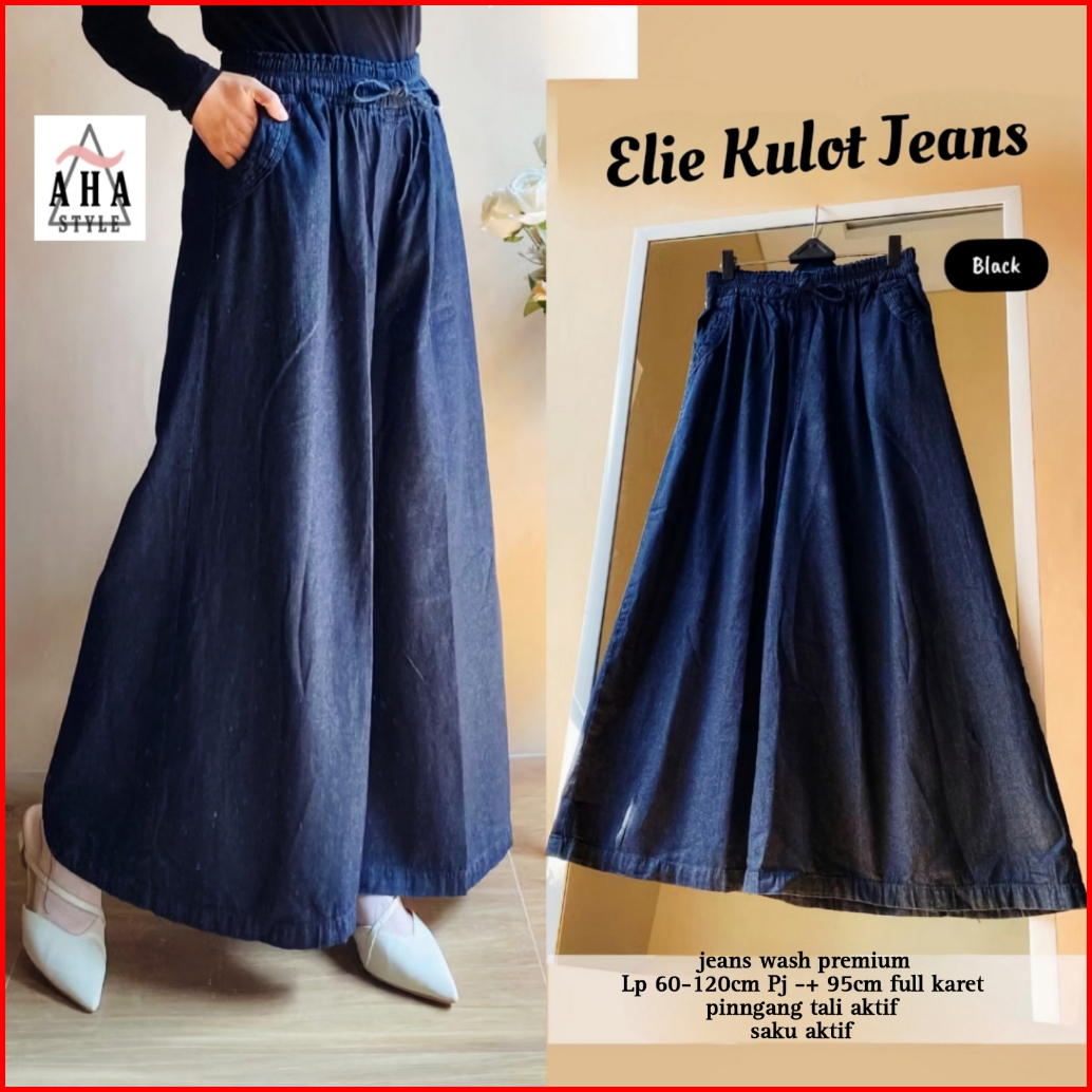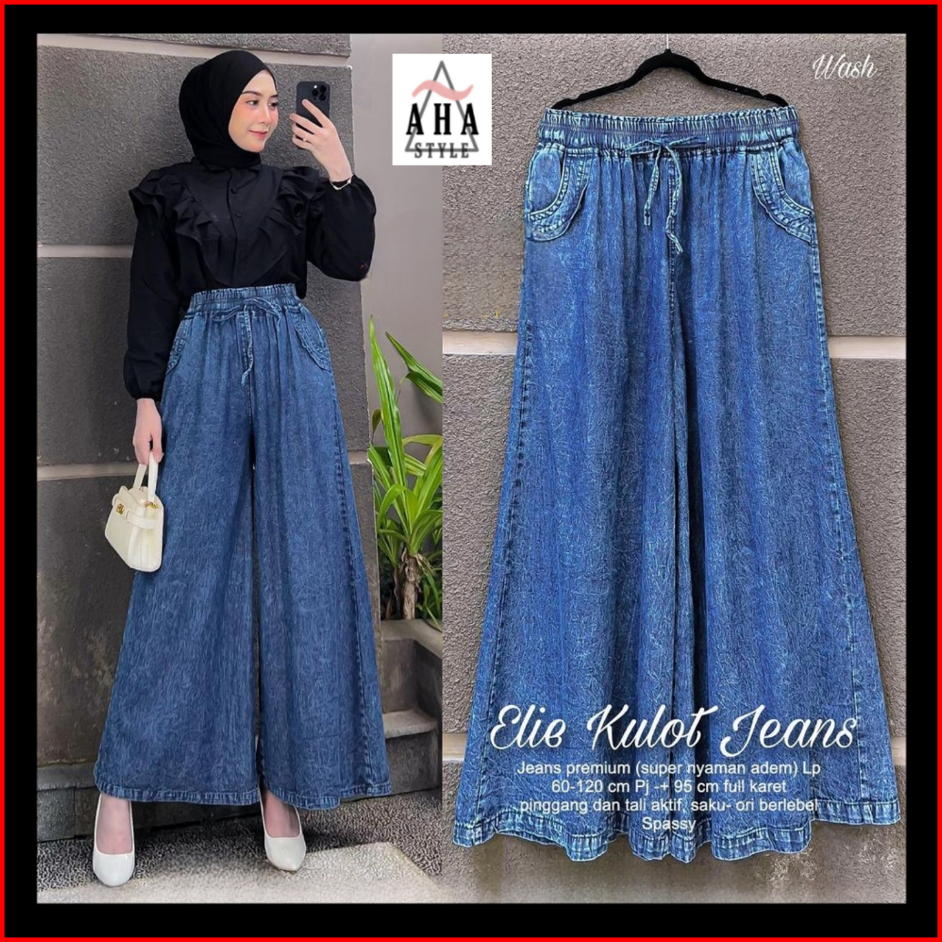 Celana Panjang Kulot Jeans Wanita Elie Jumbo Big Size Palazzo Hight Waist Payung Kekinian Simpel
