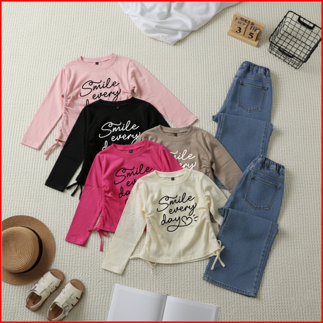 Setelan Baju Anak Perempuan 1-12 Tahun Kaos Lengan Panjang Smile Every Day Celana Jeans Kulot Modis Kekinian Korea Lucu