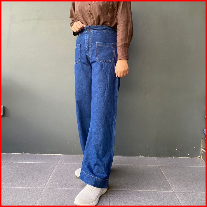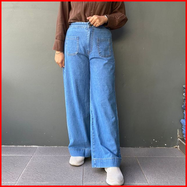 Celana Kulot Jeans Highwaist Patch Pocket Panjang 100cm Fit Bb 43-60kg Lezahrasignature Wide Leg Denim Zilla