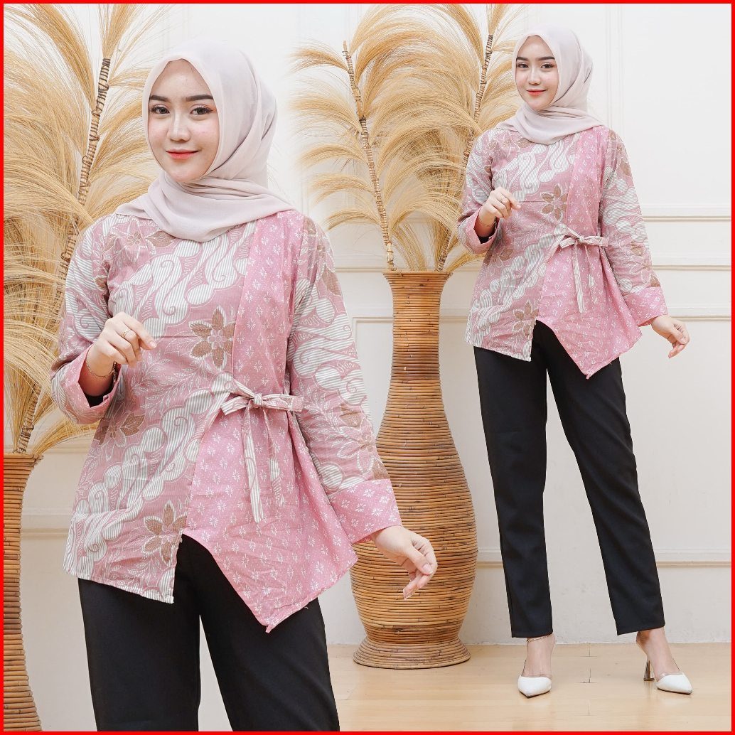 Blouse Batik Wanita Tali Samping Asimetris Atasan Lengan Panjang Modern Model