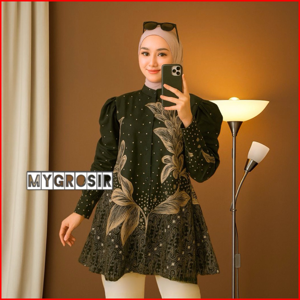 Blouse Batik Wanita Lengan Panjang Puffy Elegan Kemeja Kerja Modern Baju Kantor Casual Trendy Sutena Burgundy