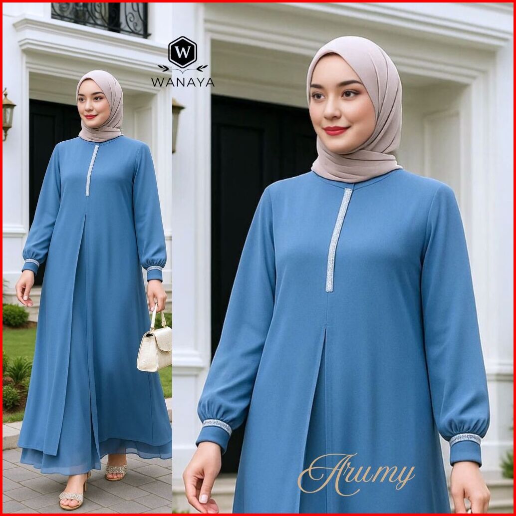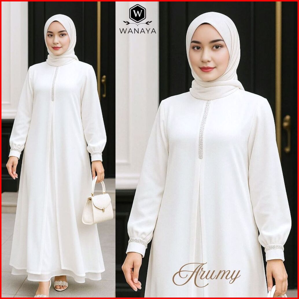 New Gamis Abaya Trendy Arumy Ceruty Babydoll Hitam Putih Full Puring Fitur Payet Kristal Swarovski