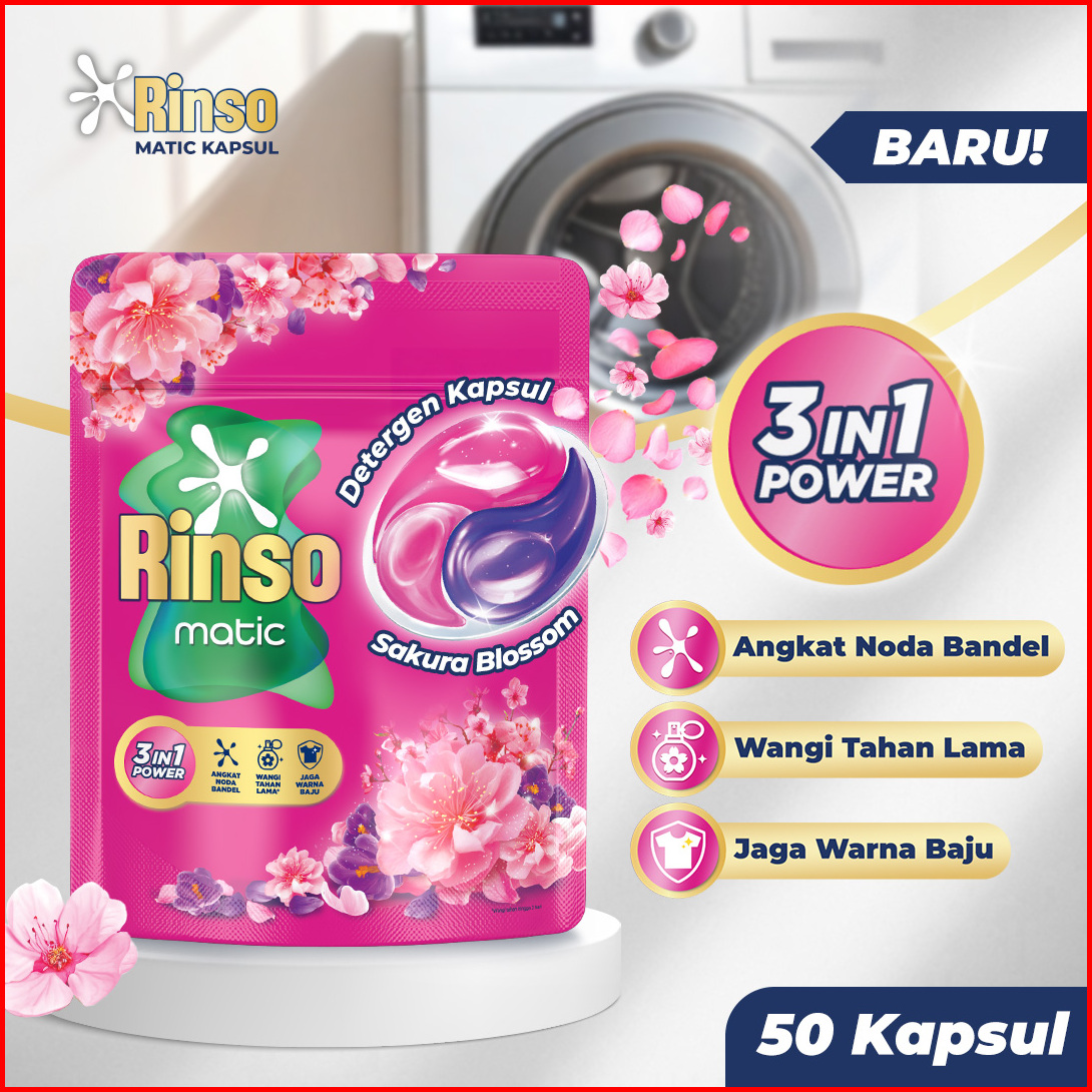 Baru Rinso Kapsul Sakura Blossom Deterjen Cair Matic Isi 50 Capsule Dengan 3 In 1 Power Detergent Konsentrat 525g