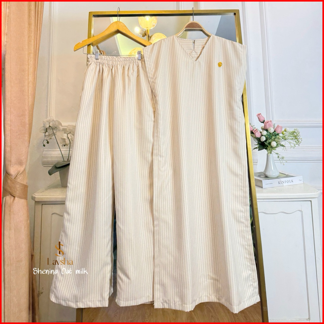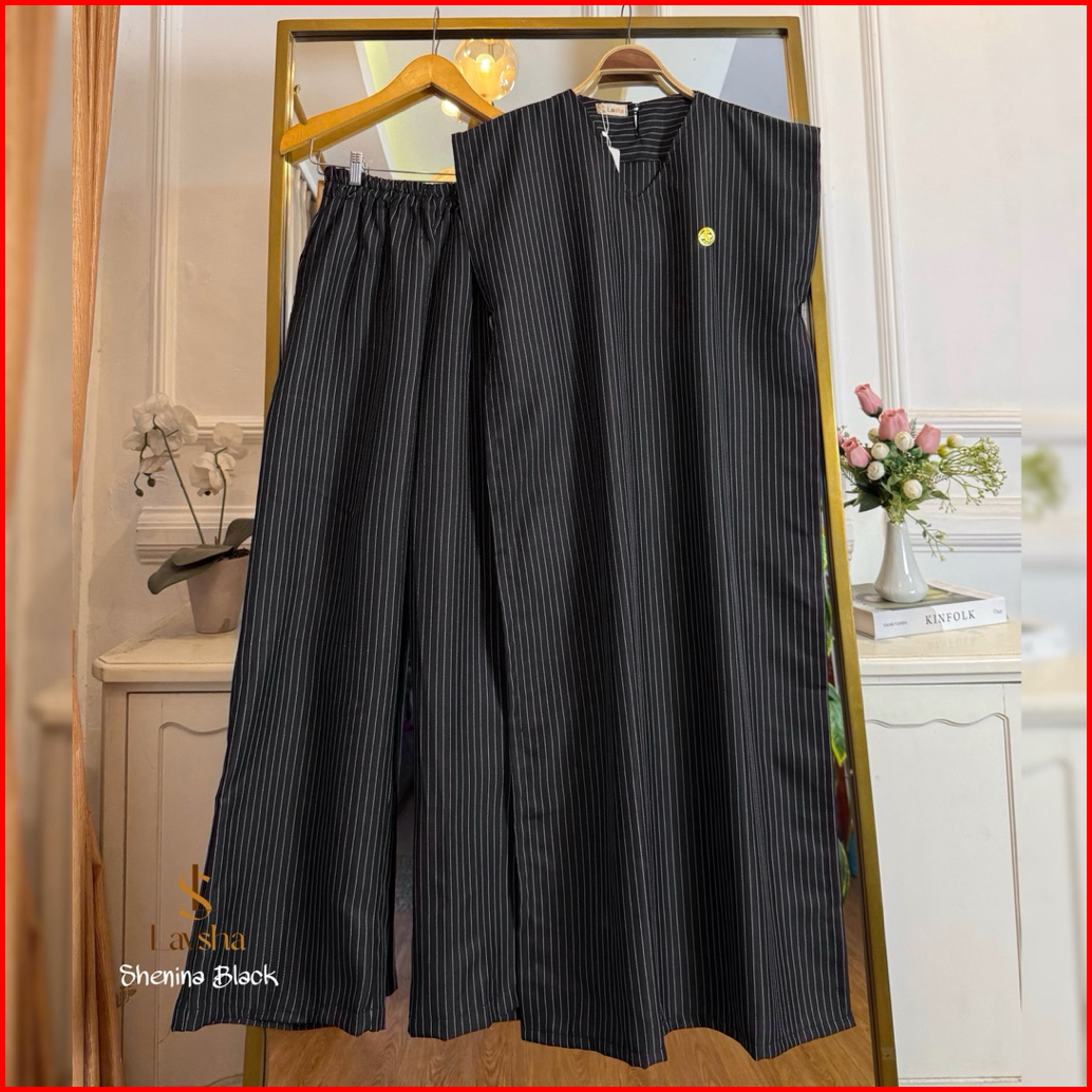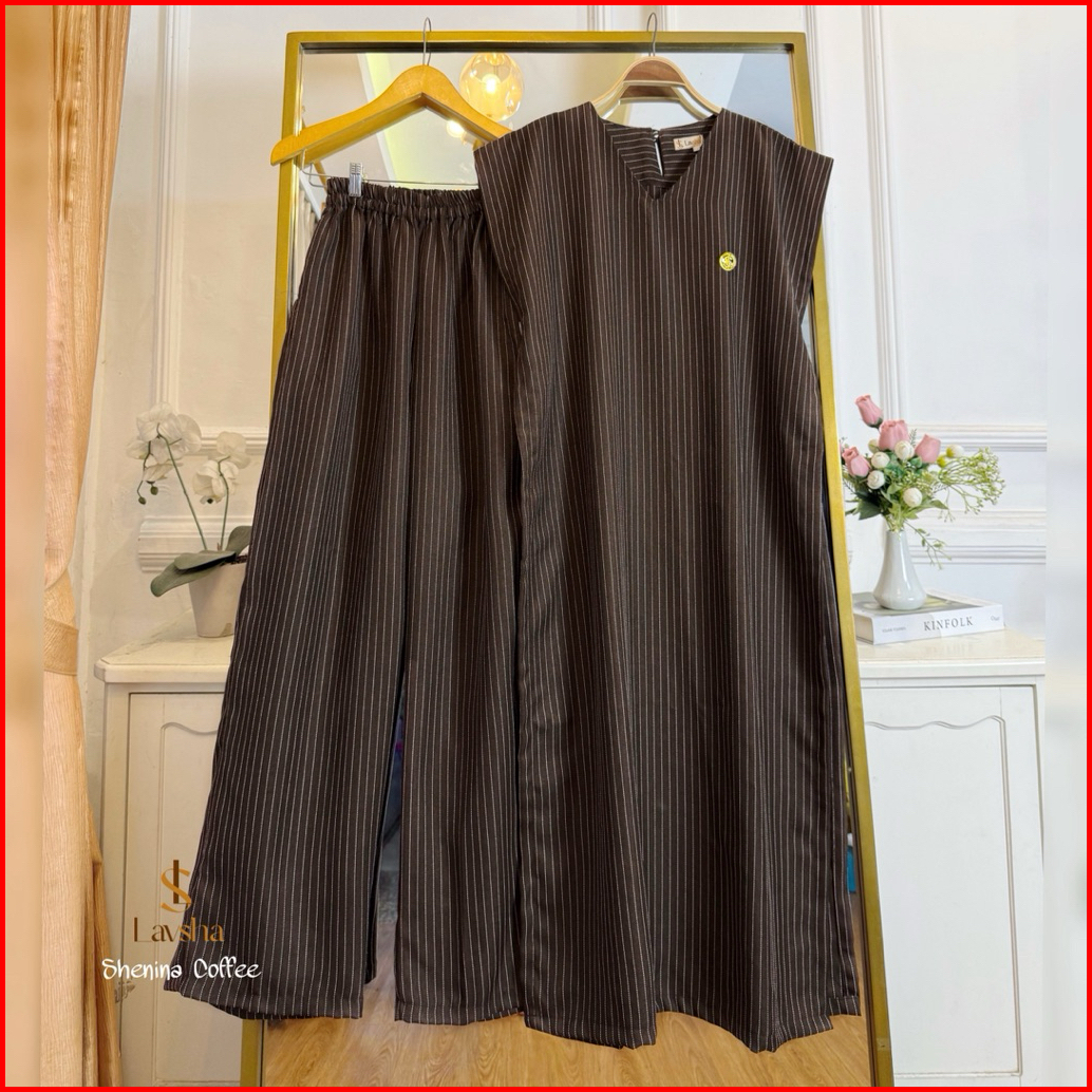 Shenina Set Long Vest Dan Kulot Stripe Semi Woll Casual Kekinian Karet Pinggang