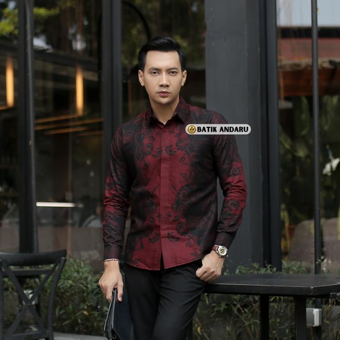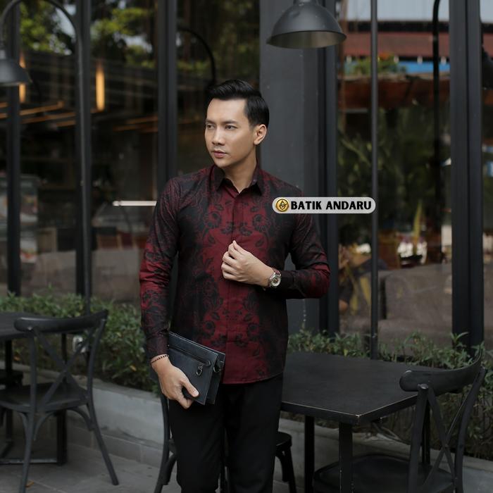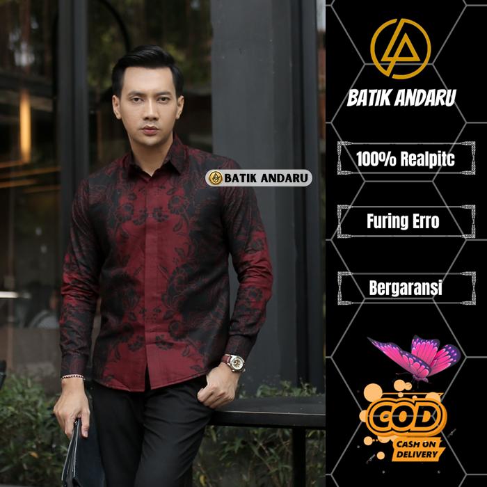 HAWARI BATIK ANDARU BAJU BATIK PRIA LENGAN PANJANG FULL FURING KATUN PRINTING MODERN HALUS PREMIUM WARNA MERAH MAROON - M