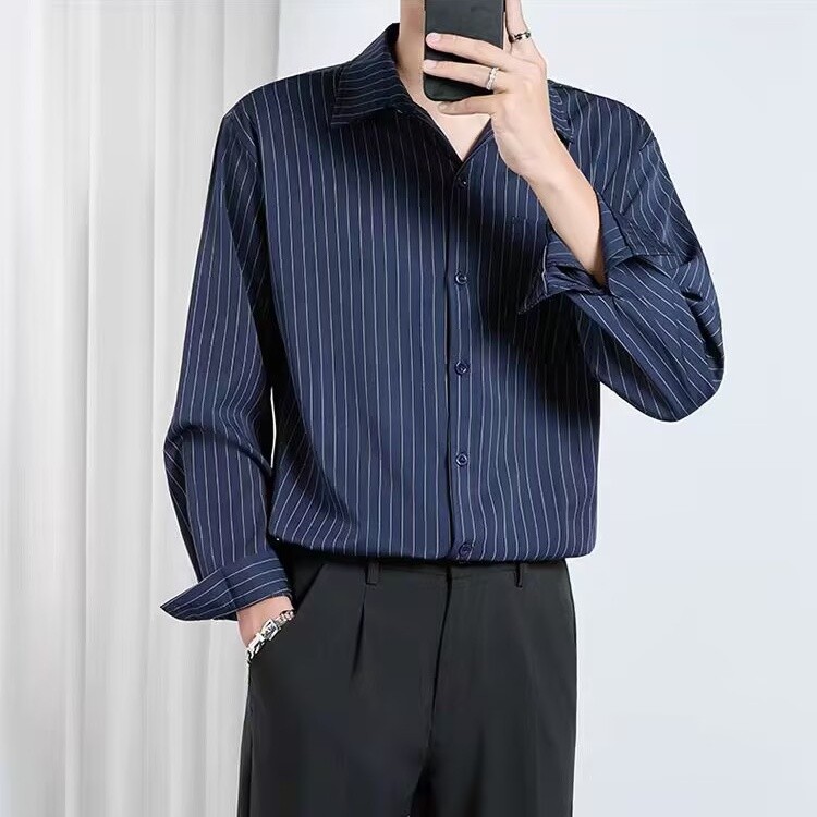ST.LABSTUDIO Kemeja pria lengan panjang bergaris slim fit ukuran besar atasan kemeja lengan panjang