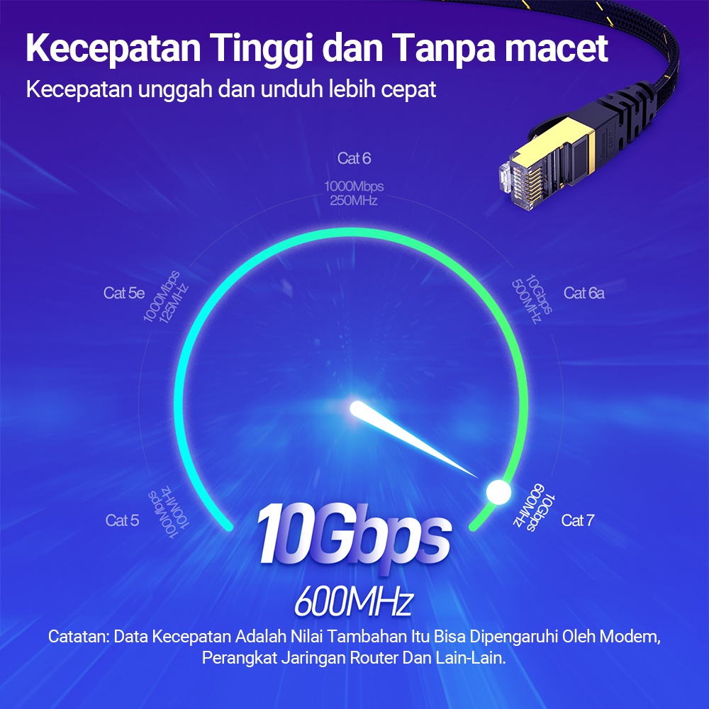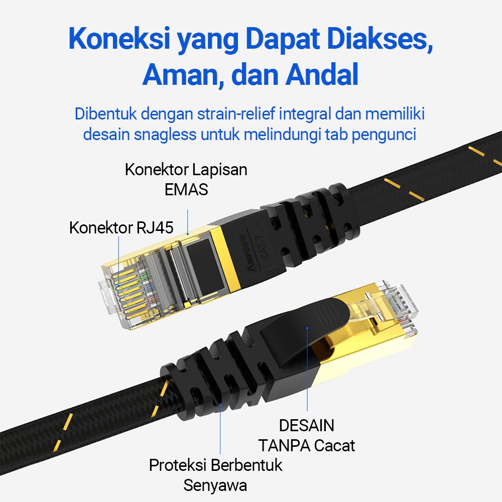 AMPCOM CAT7 Kabel Ethernet (10G 600MHz), Patch Jaringan RJ45 Datar Terlindung, Kabel, Timbal Berlapis Emas 50u, Jalinan Poliester