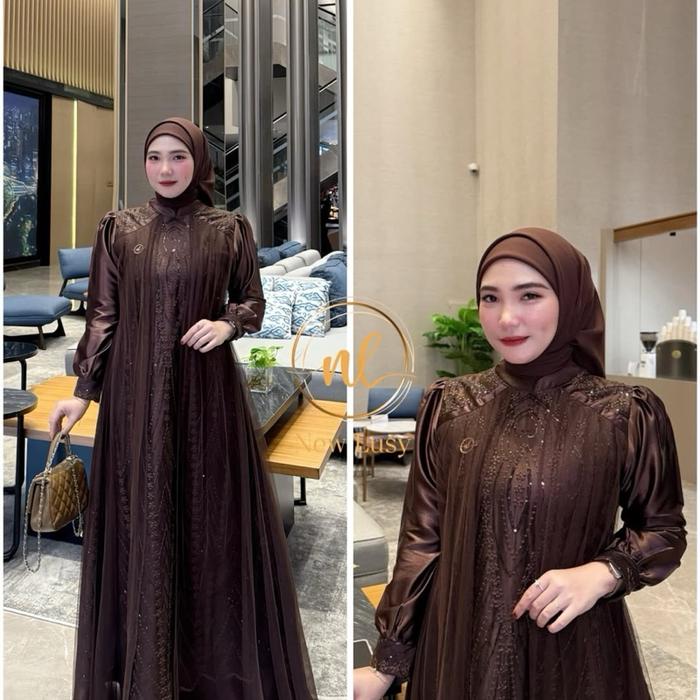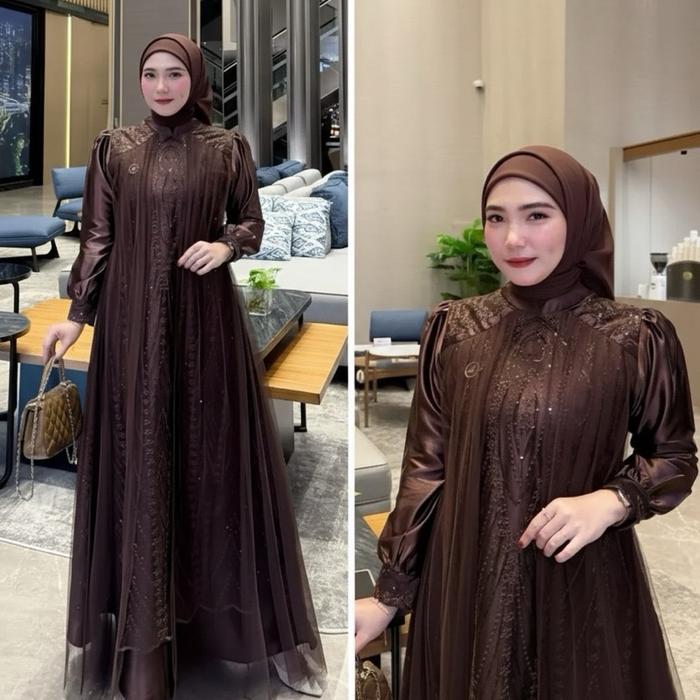 DRESS LEYA KONDANGAN/LEBARAN CANTIK BAHAN VELVET PLUS BRUKAT MEWAHH ELEGAN GAMIS PESTA KEKINIAN TERBARU WARNA MAHOGANI BURGUNDI - MAHOGANY, M
