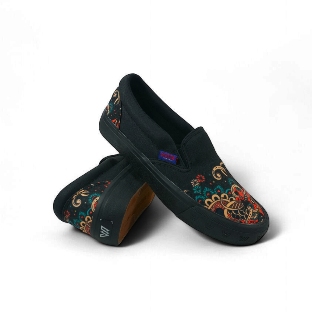 Wakacaw - Sepatu Slip On Batik Etnik All Black Sepatu Sneakers Slip On Pria Dan Wanita