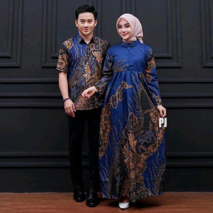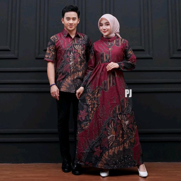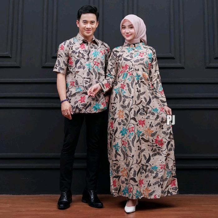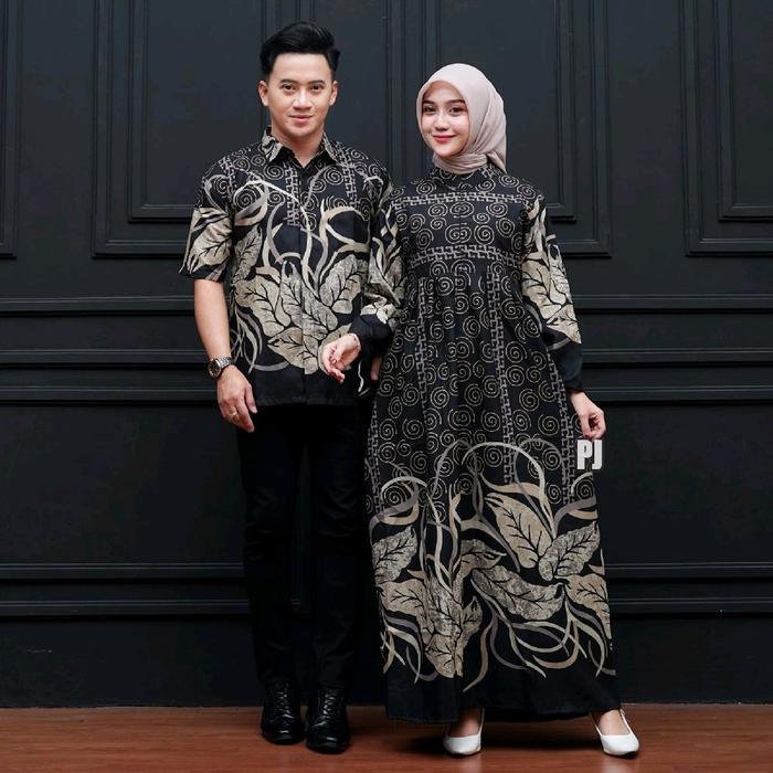 HARGA SEPASANG - BAJU BATIK COUPLE MODERN - SARIMBIT BATIK KONDANGAN KEKINIAN - COUPLE GAMIS BATIK DAN KEMEJA POLYESTER PASANGAN SERAGAM MUSLIM DRESS PANJANG - CP. GH TARONG A, PRIA M WANITA L