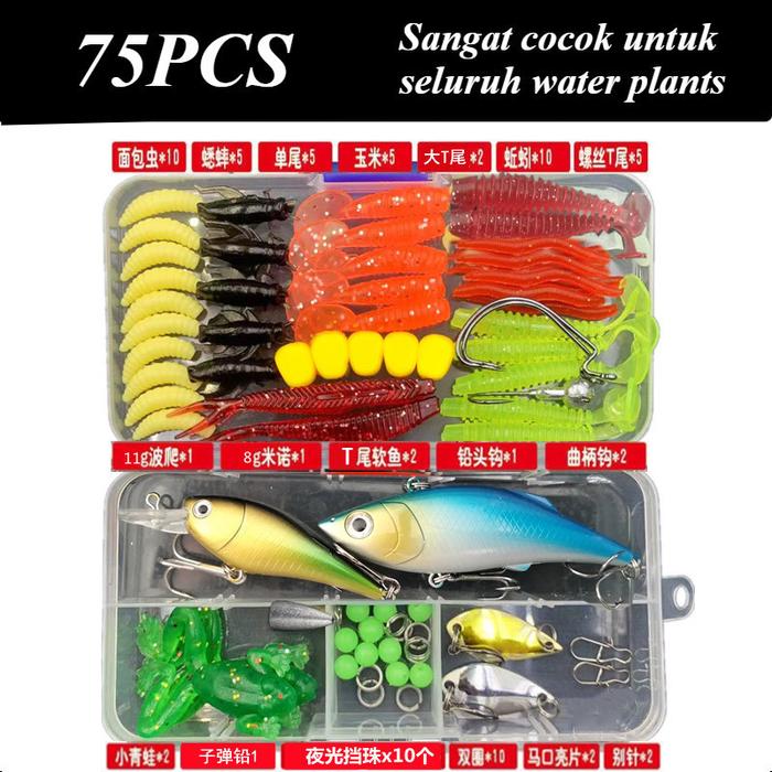 75pcs Set Umpan Pancing Fishing Tackle Box Soft Plastic Lure Umpan Campur Set Aksesoris Umpan Pancing - 75PCS