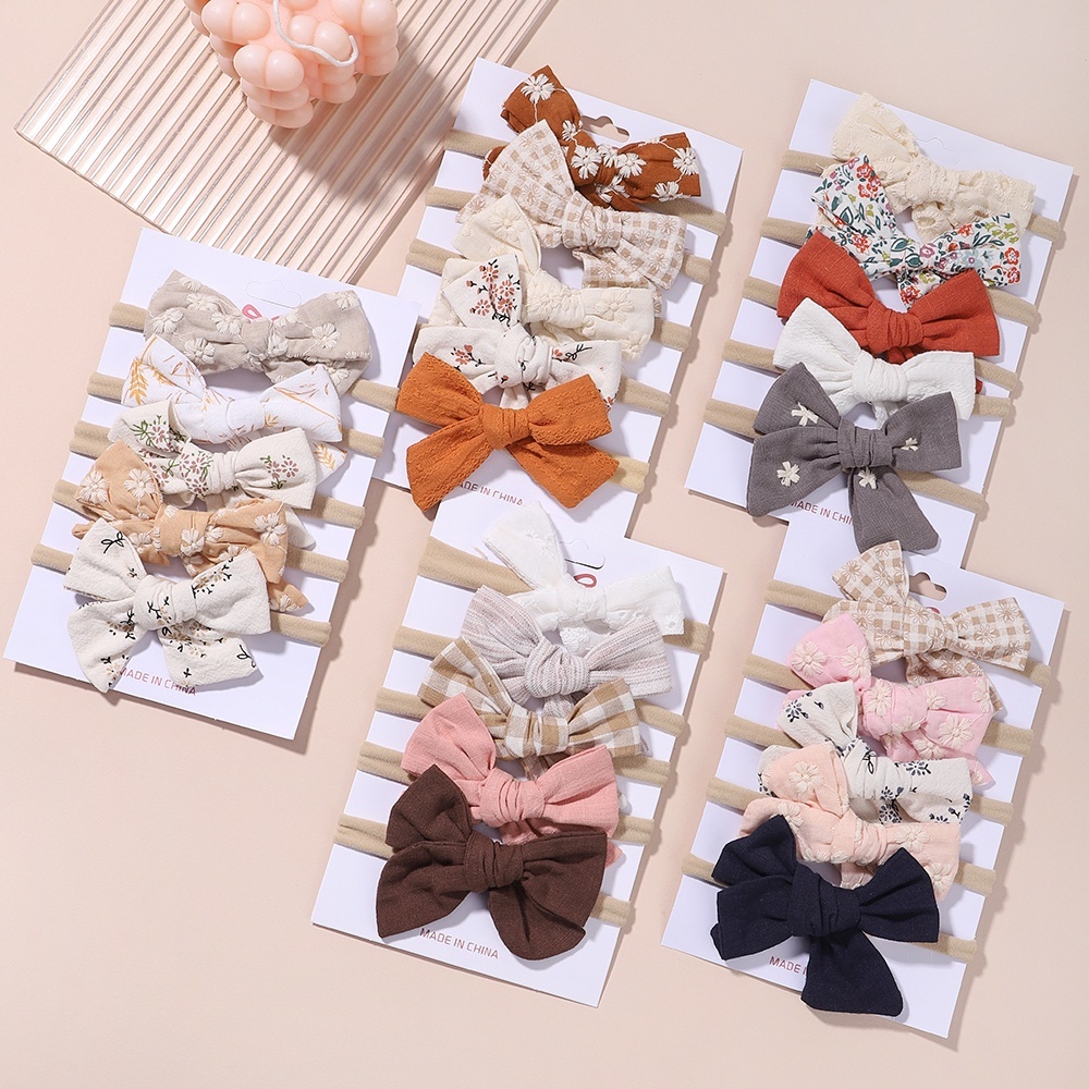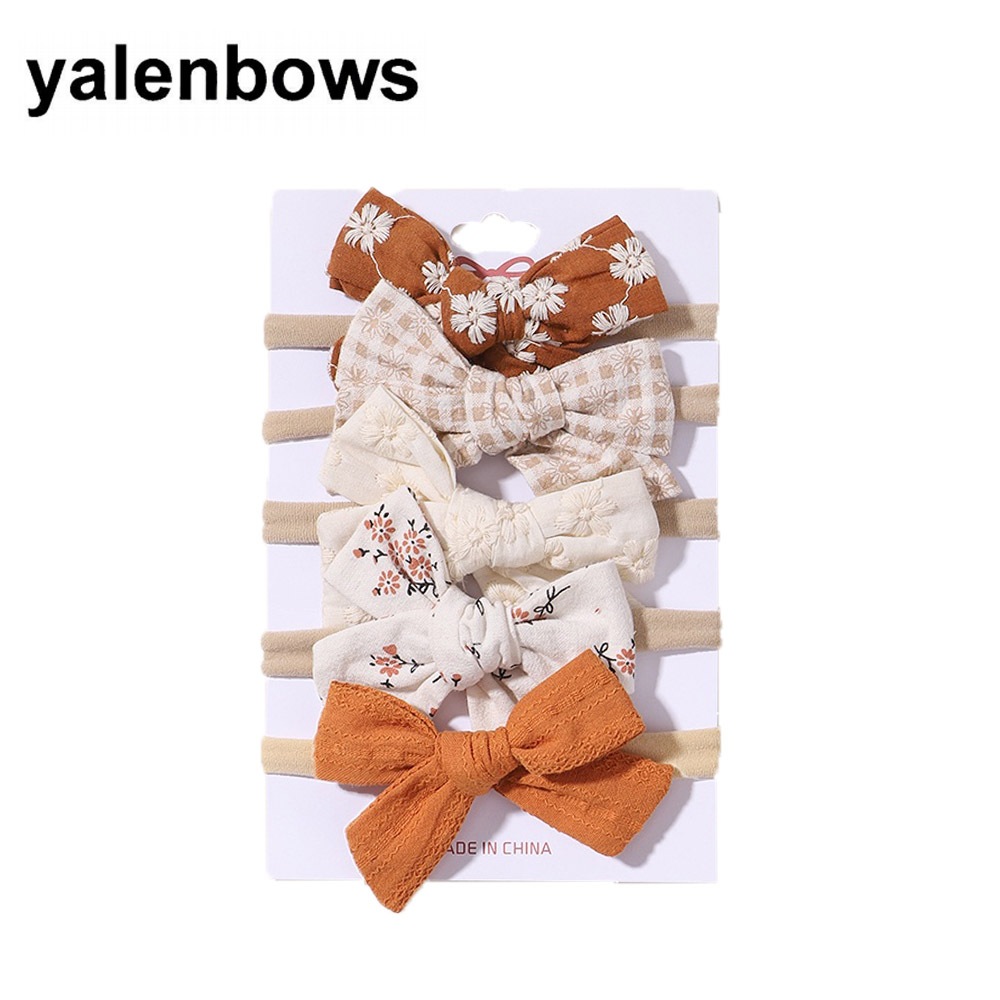 Bando Bayi 5pcs/Set Cotton Linen warna padat untuk bayi perempuan mencetak bordir nilon elastis hairband baru lahir aks