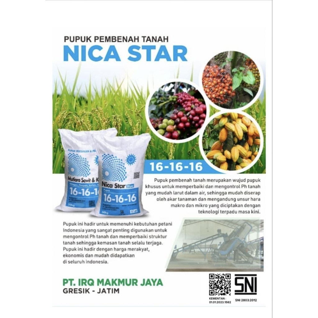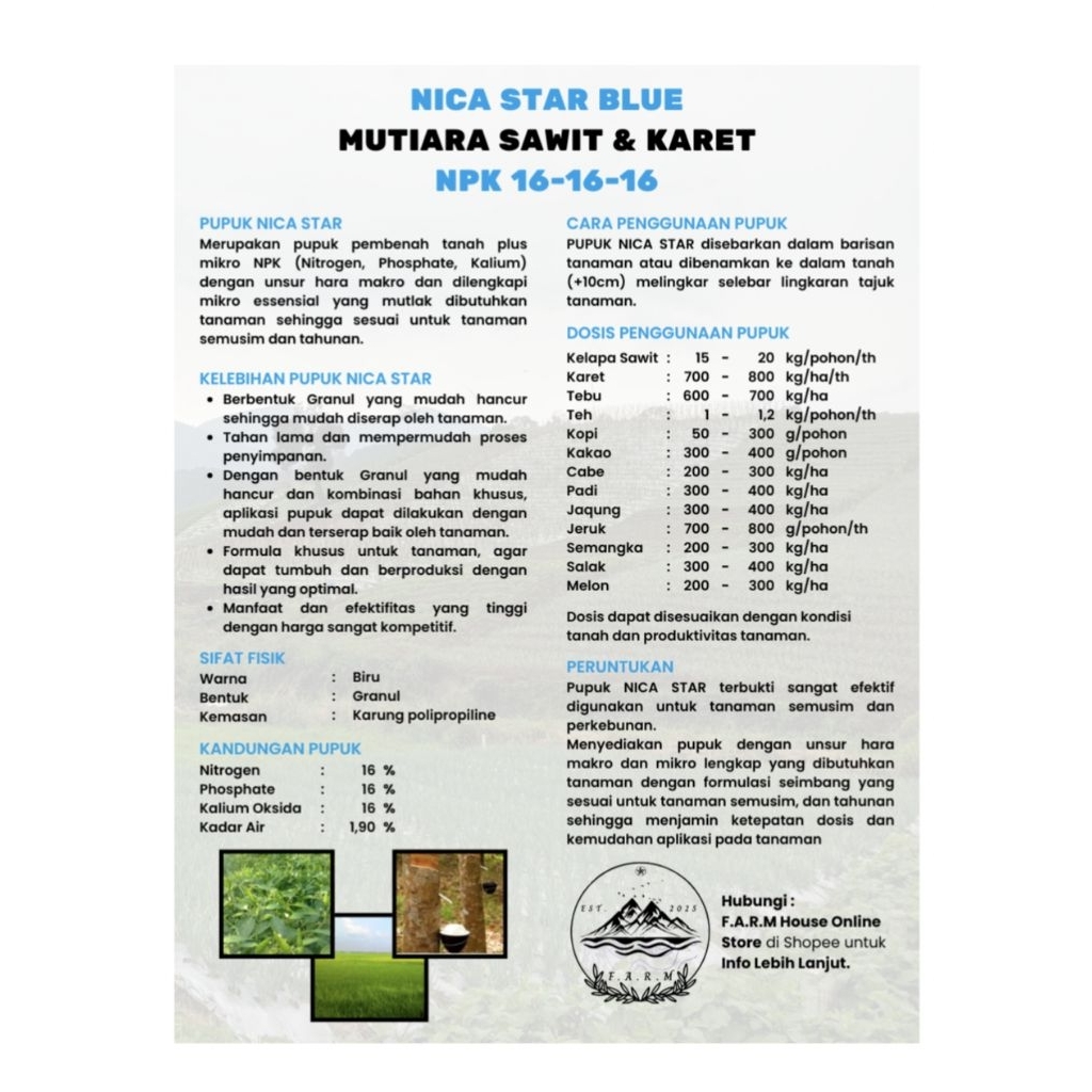NICA STAR BLUE PUPUK NPK 16-16-16 MUTIARA SAWIT & KARET REPACK 1 Kg