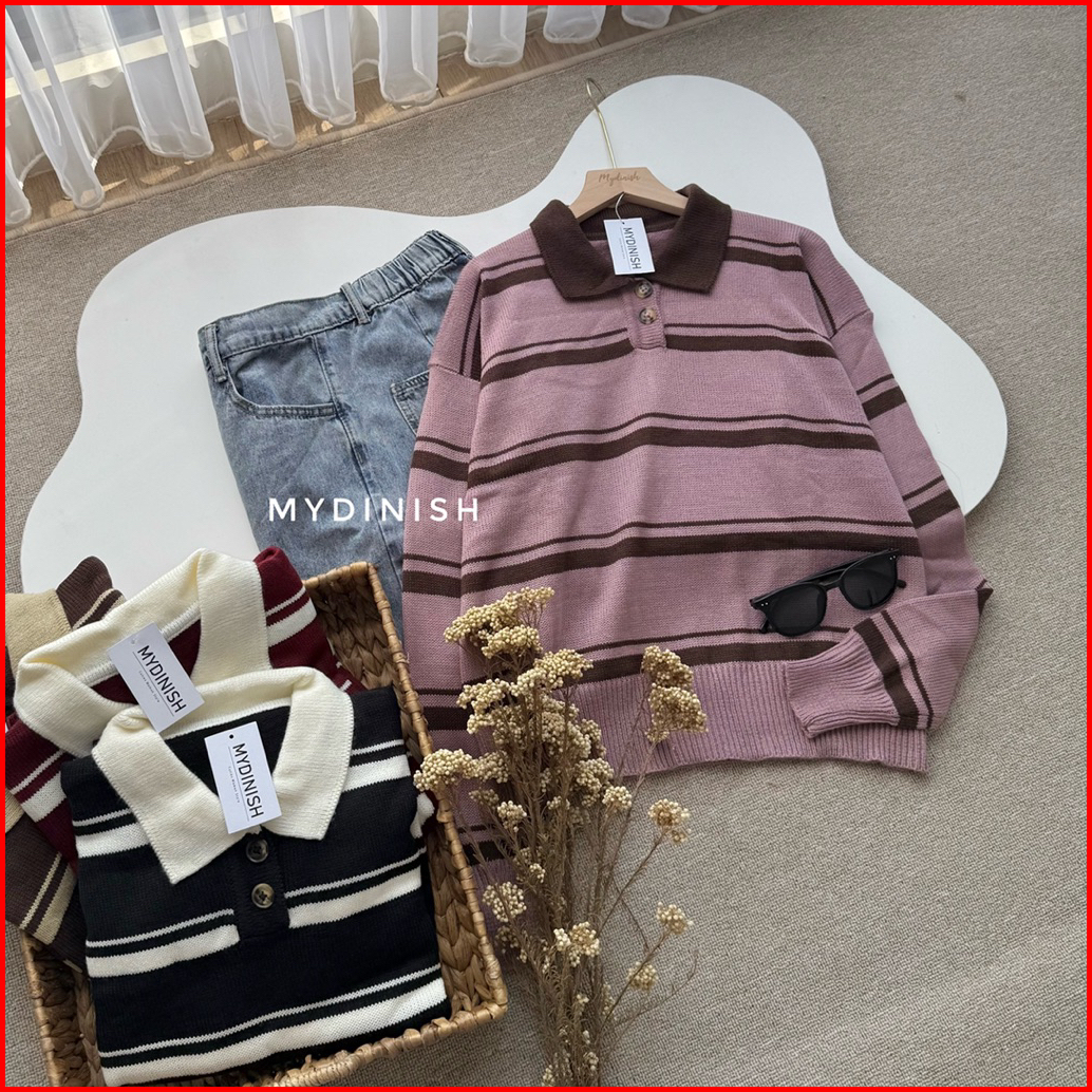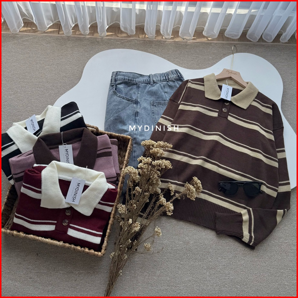 Yoyo Blouse Atasan Rajut Wanita Berkerah Polo Motif Setrip