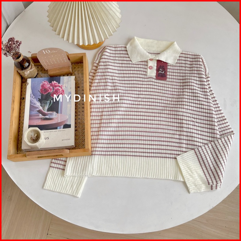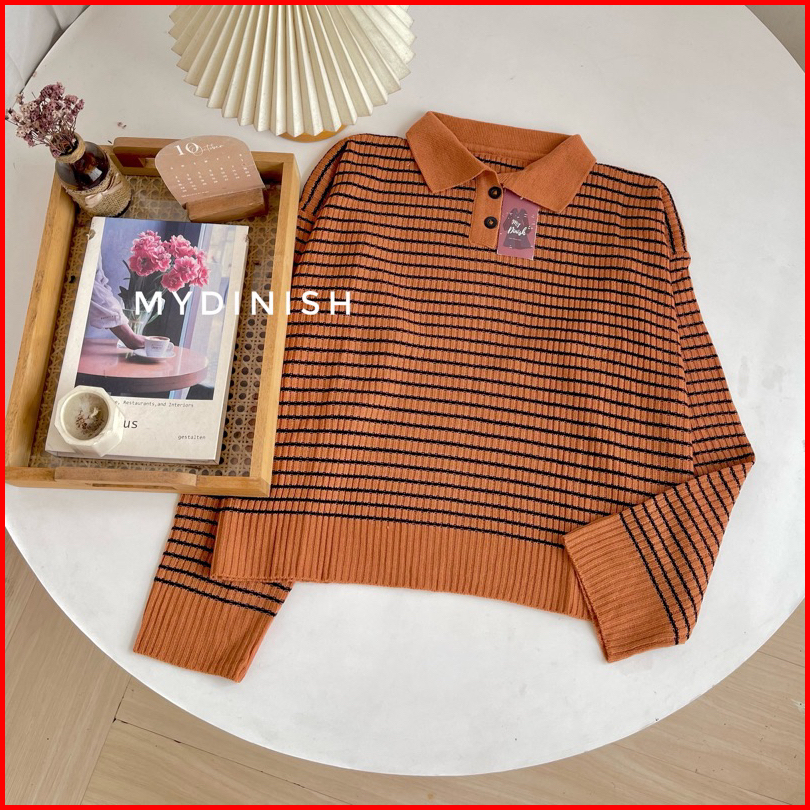 Nabilah Polo Blouse - Atasan Rajut Wanita Berkerah Motif Garis Korean Style