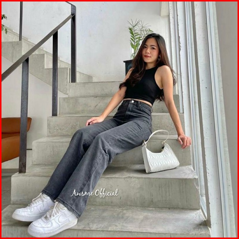 Awsme - Highwaist Loose Jeans Snowblack Hw Kulot Loose Jeans Celana Jeans Panjang Wanita Korean