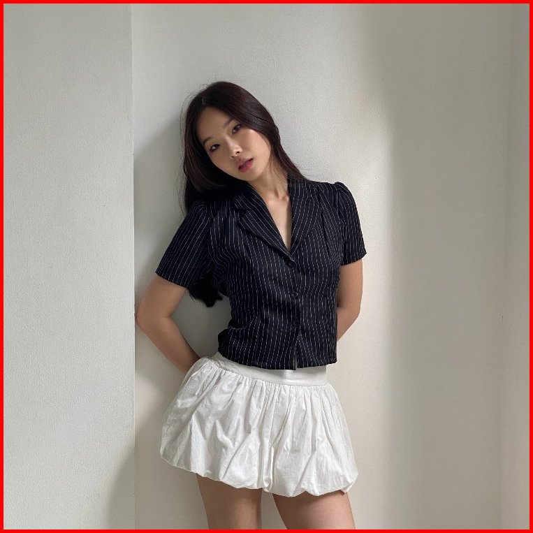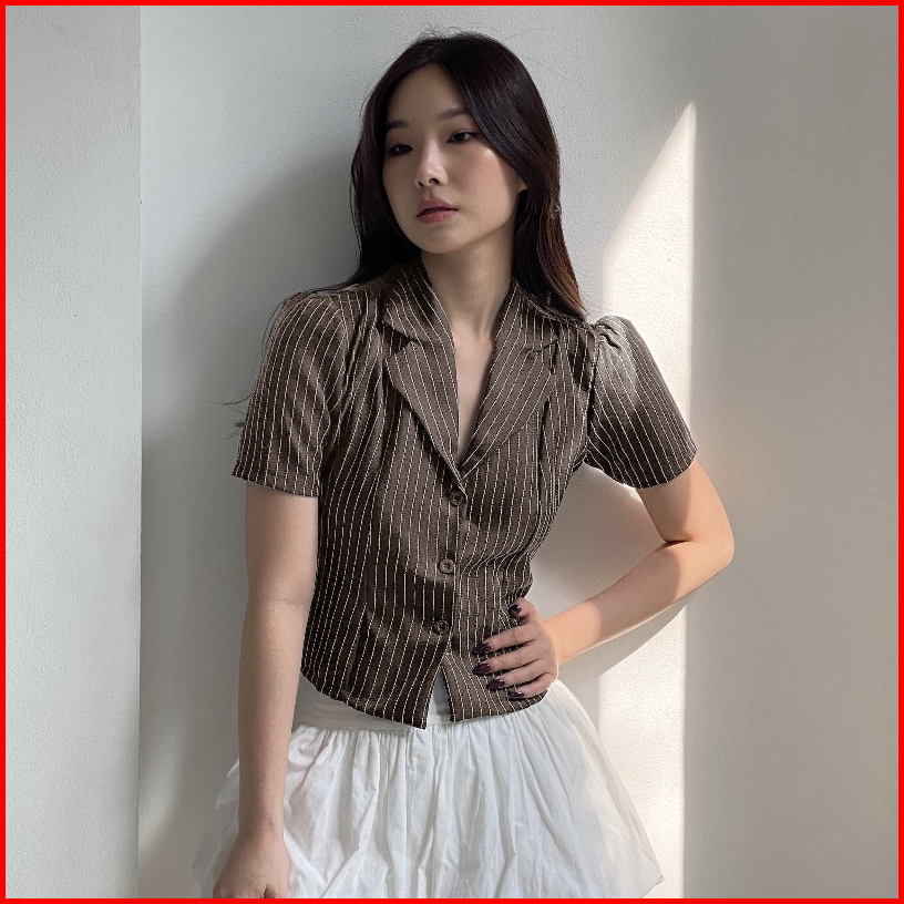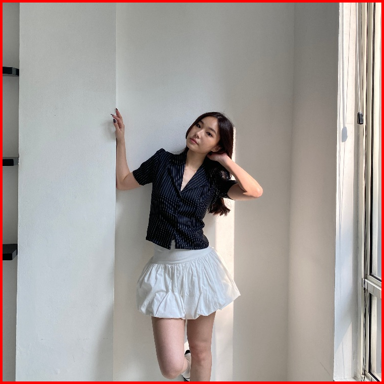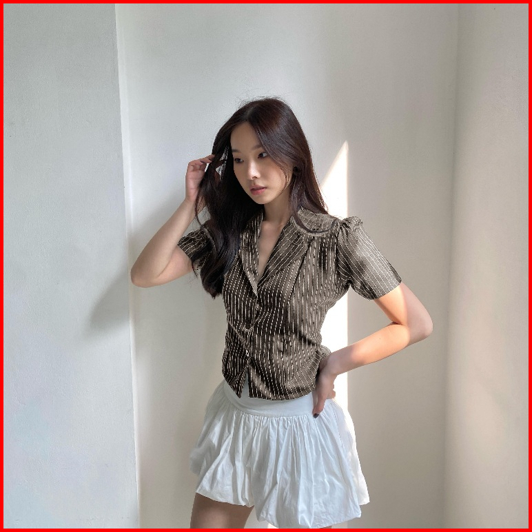 Oxford Shirt Nyre The Label Kemeja Wanita Hitam Pendek Stretch Fit Stripe Karet Casual Simple Kerah