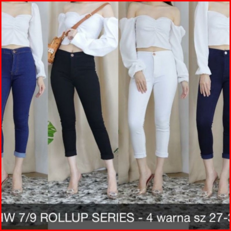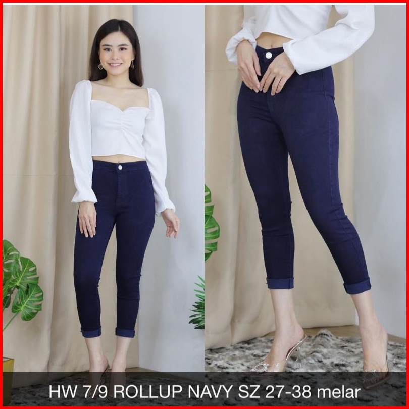 Celana Hw 7 9 Rollup Black White Elblue Navy 27-34. Celana 7 9 Highwaist Hw Hitam Putih Nevy Biru