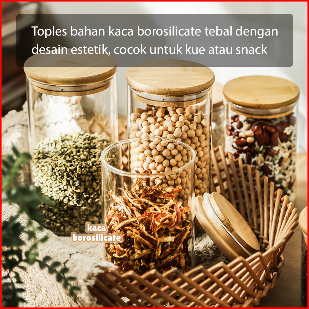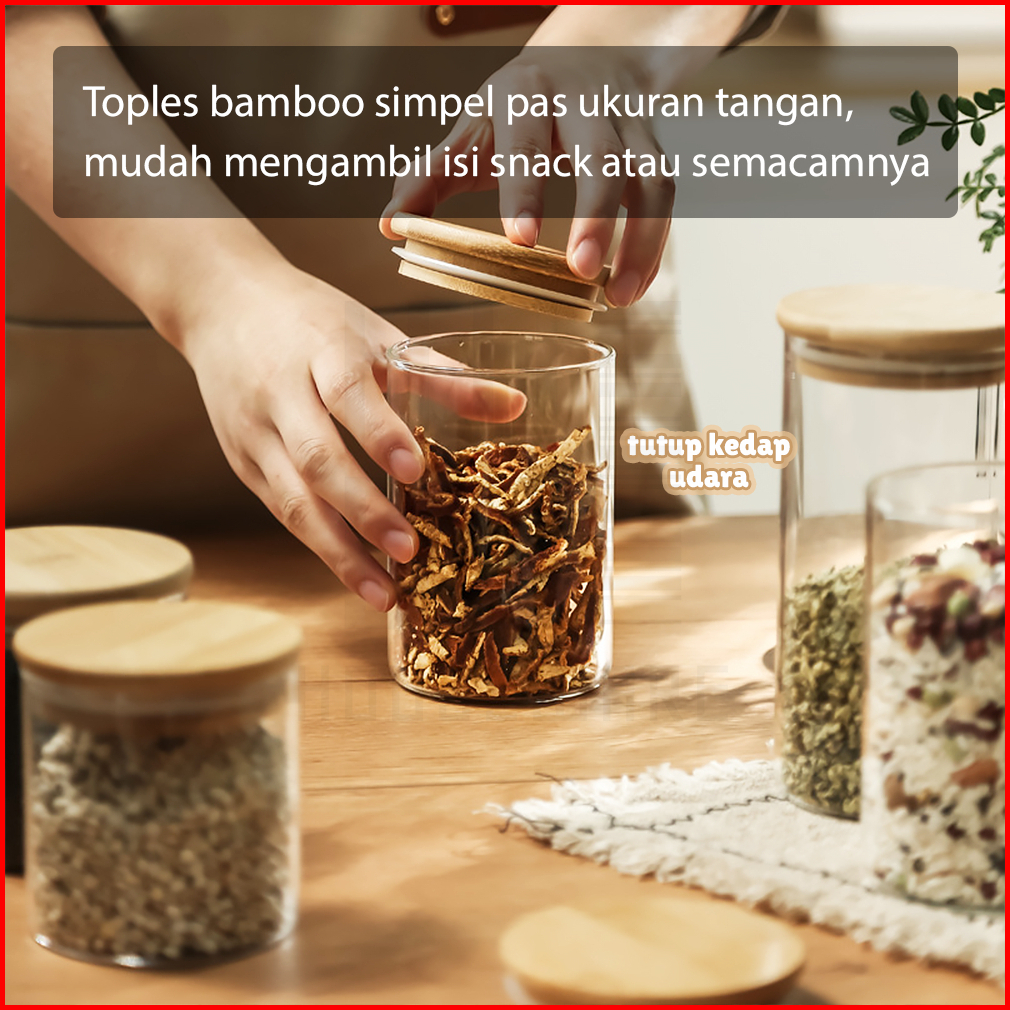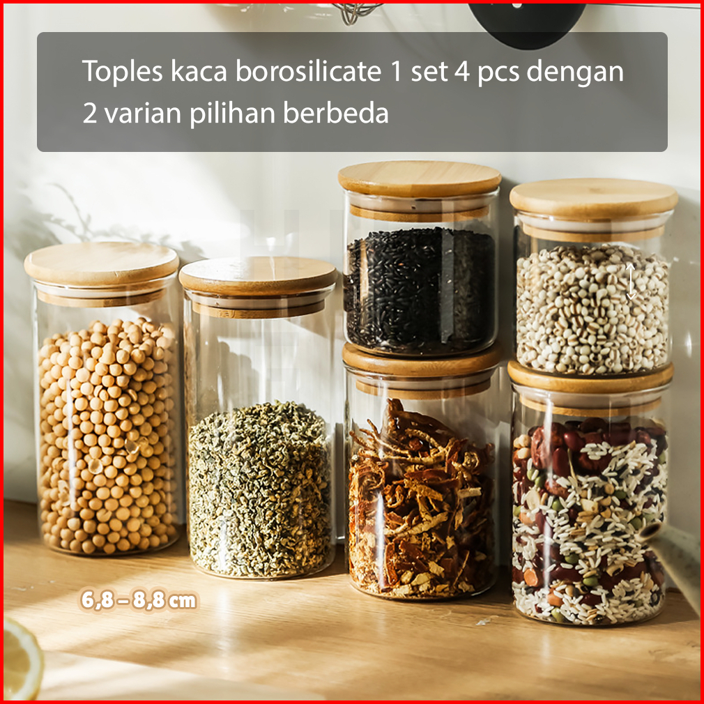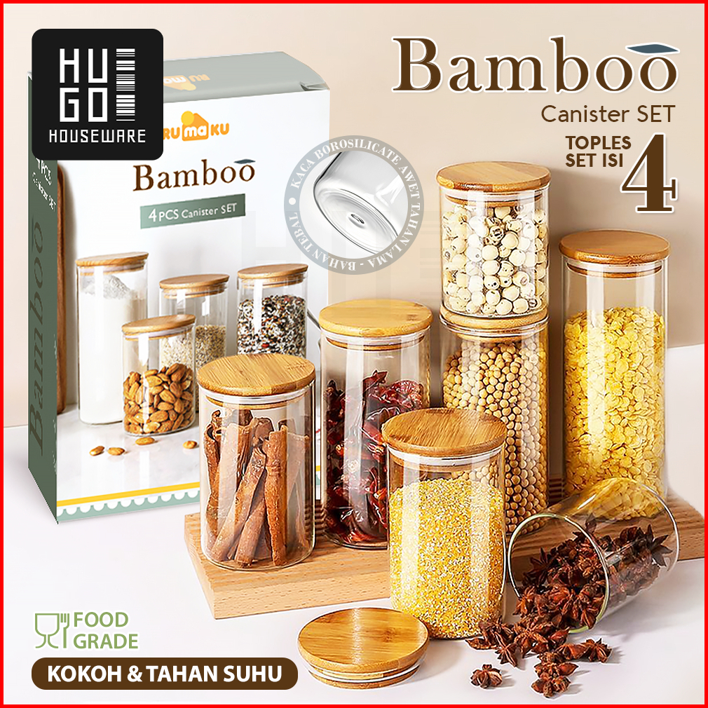Hugo Toples Lebaran Set 4 Pcs Kado Lebaran Toples Tutup Bambu Toples Kue Kering Snack Penyimpanan Makanan Toples Kaca Ke