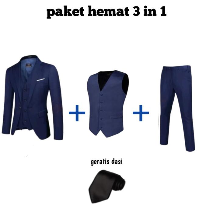 STELAN JAS BLAZER PRIA FORMAL 3 IN 1 JAS ROMPI DAN CELANA WARNA BIRU NAVY MODEL SLIMFIT TERBARU GERTIS DASI - 3 IN 1 BIRU NAVY, S