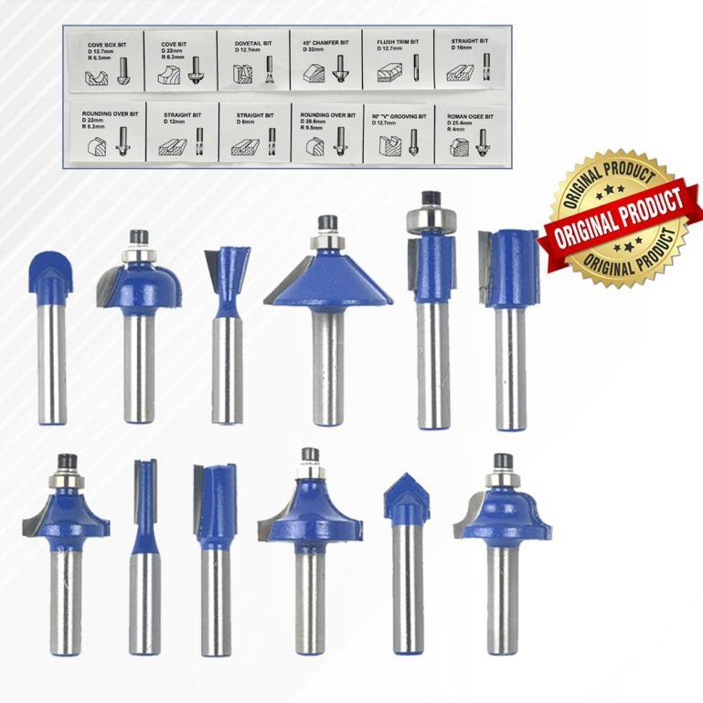 Ryu Mata Profil Kayu Set 12 Pcs Router Bit 1/4" Mata Trimmer Bit Set