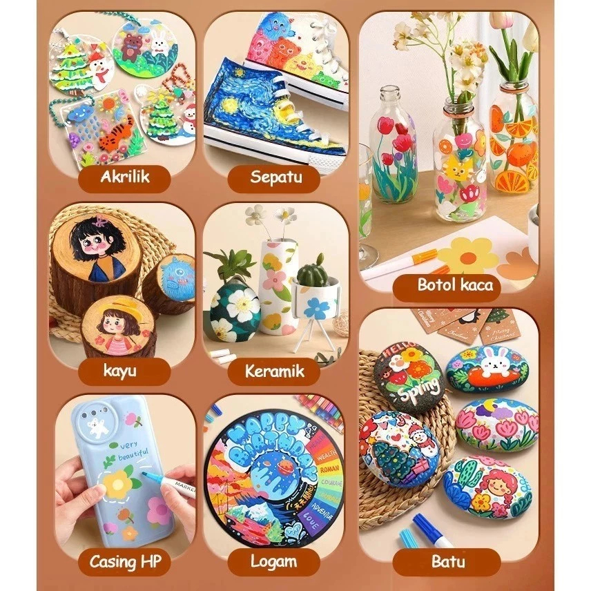Spidol Seni Akrilik / Acrylic Marker Water Based Warna Cerah 24/36/48/60/80 Warna Set - Tinta Waterproof & Ujung Fleksib