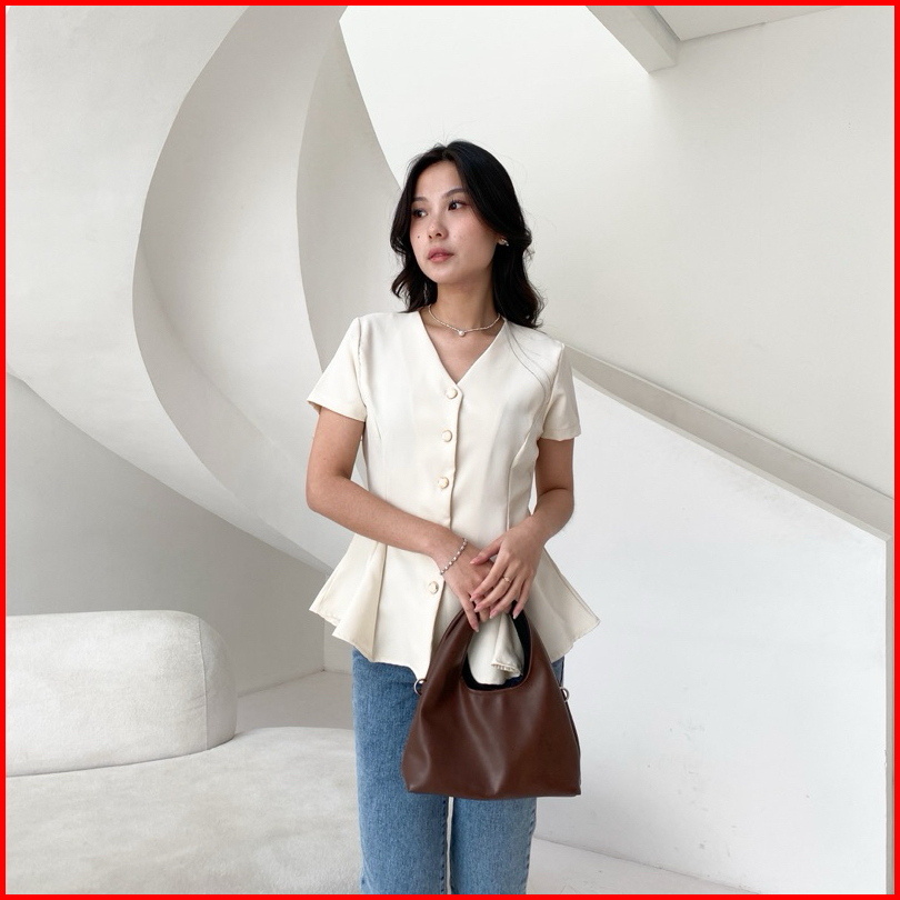 Erika Top Peplum Shirt Lengan Pendek Slim Fit Shirt Wanita Kemeja Vneck Wanita Kantor Pendek - Eleonor