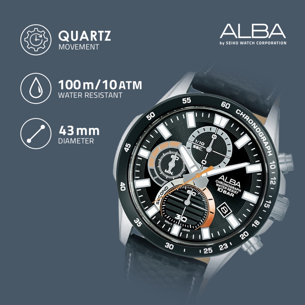 Alba Active Jam Tangan Pria Chronograph AM3975 / AM3975X1 Quartz Black Pattern Dial Genuine Leather Strap Watch