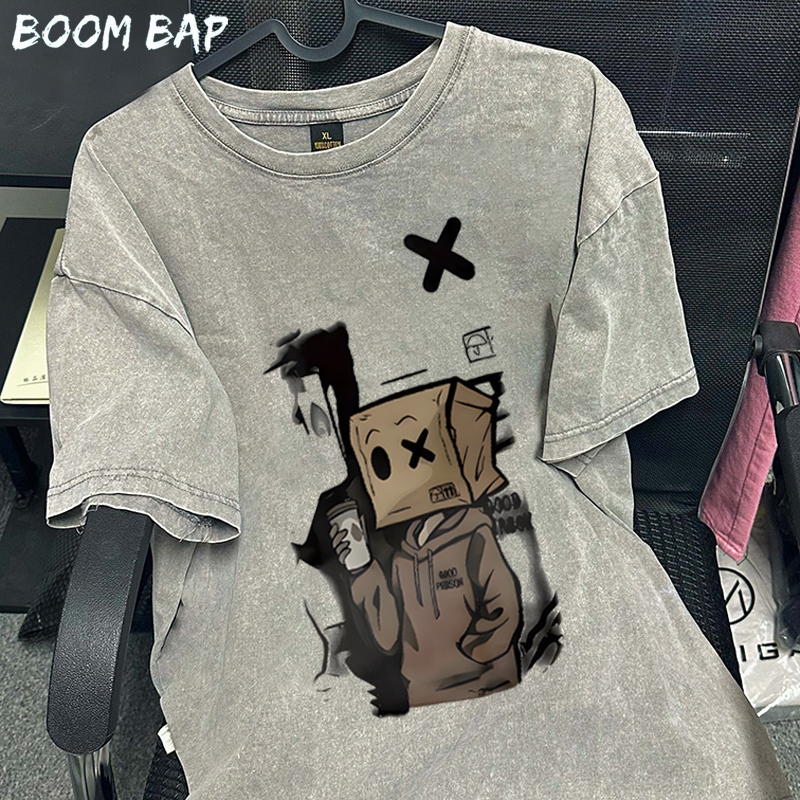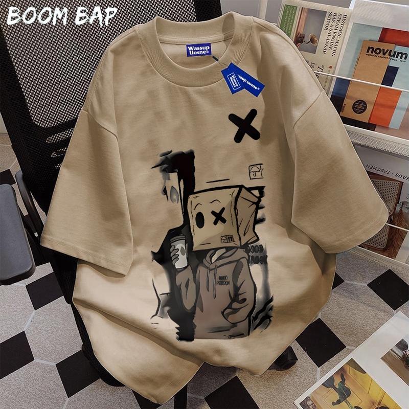 Boombap American Retro Style T-Shirt Oversize Anak Laki-Laki Kartun Print Top| Kaos Wanita Cokelat | Kaos Pria Dan Wanit