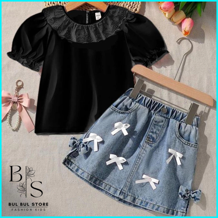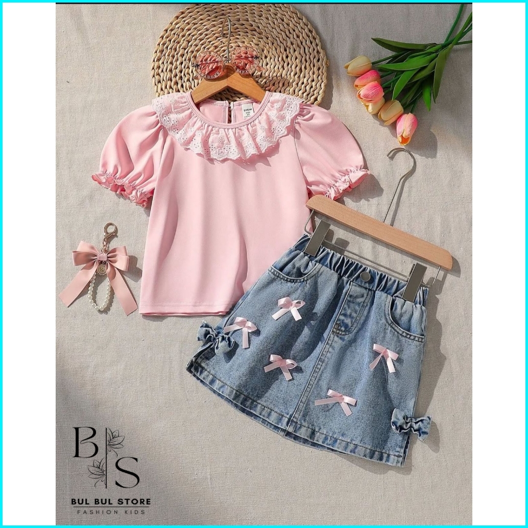 Setelan Anak Perempuan 1-5 Tahun Oneset Rok Jeans Anak Baju Anak Cewek Setelan Denim Anak Pita Renda By.bulbulstore
