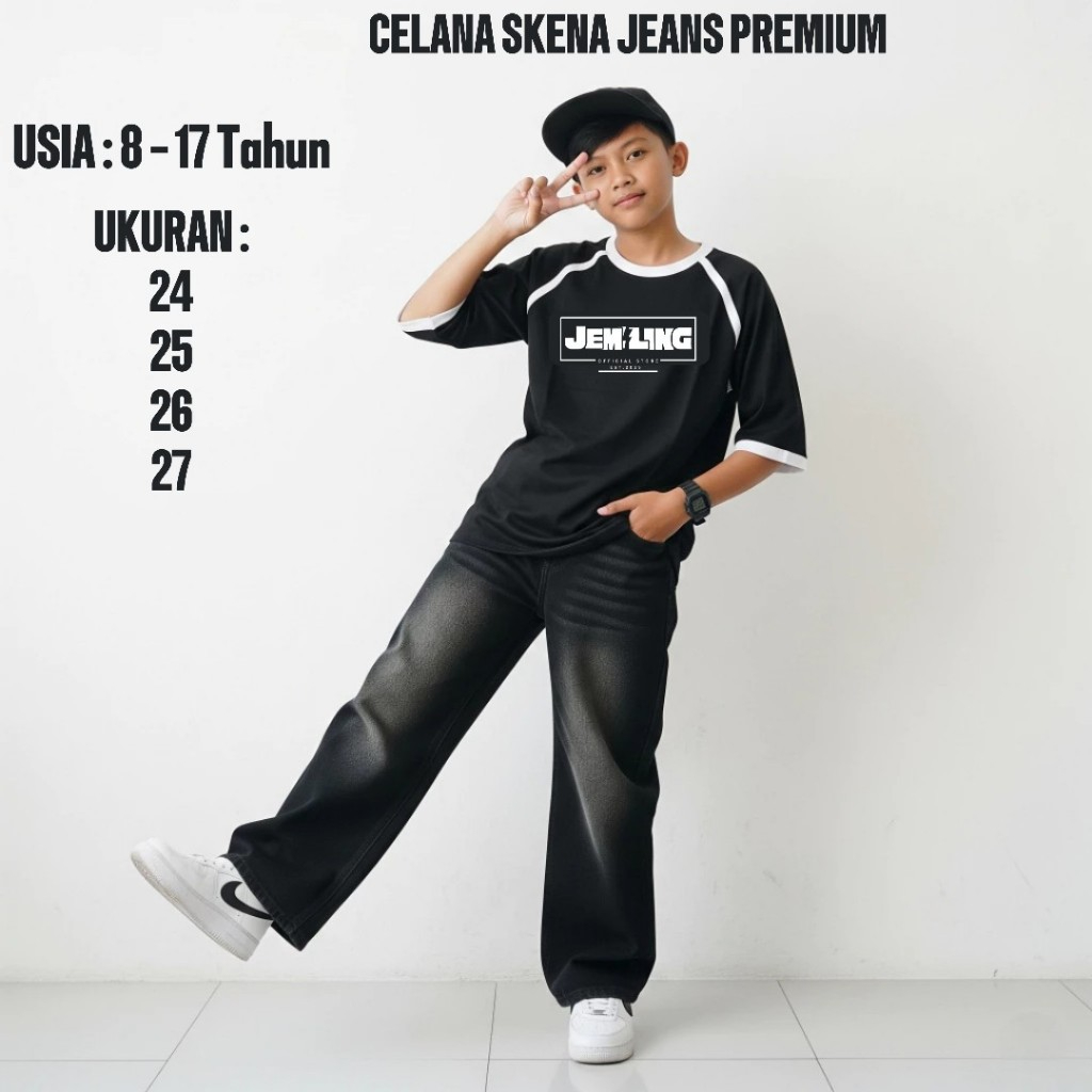 Celana Baggy Anak Laki Laki Skena Jeans Panjang Gombrong Korean Style Hitam Polos Usia 8 - 17 Tahun