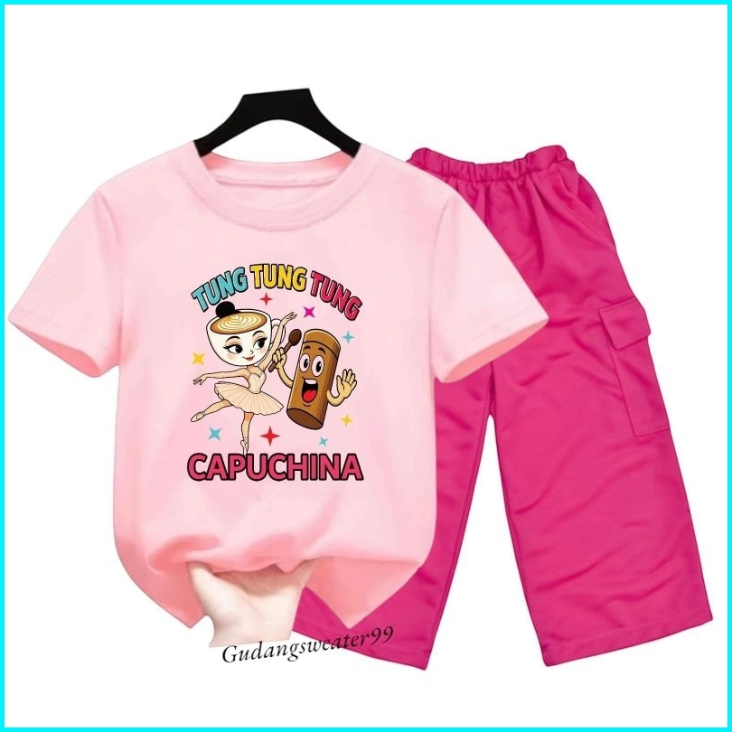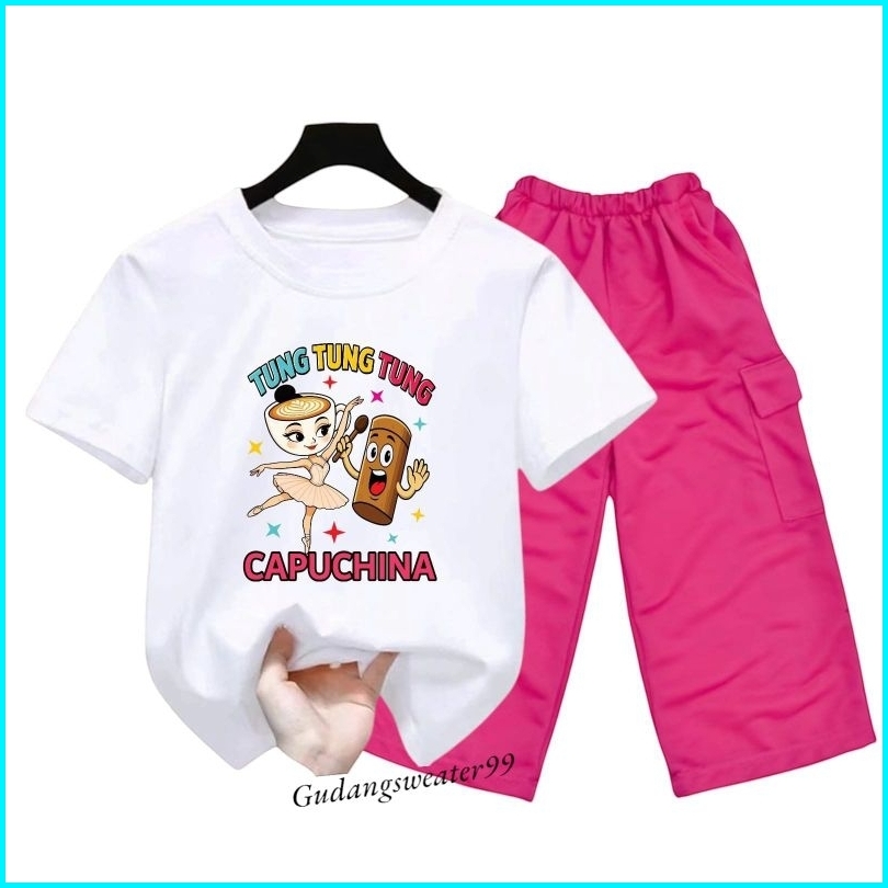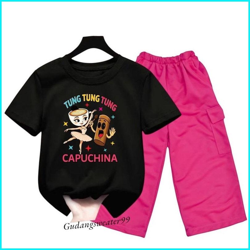 Setelan Anak Perempuan Tung Tung Ballerina Capuchina Usia 5-12 Tahun Kaos Dan Celana Cargo Model Kekinian