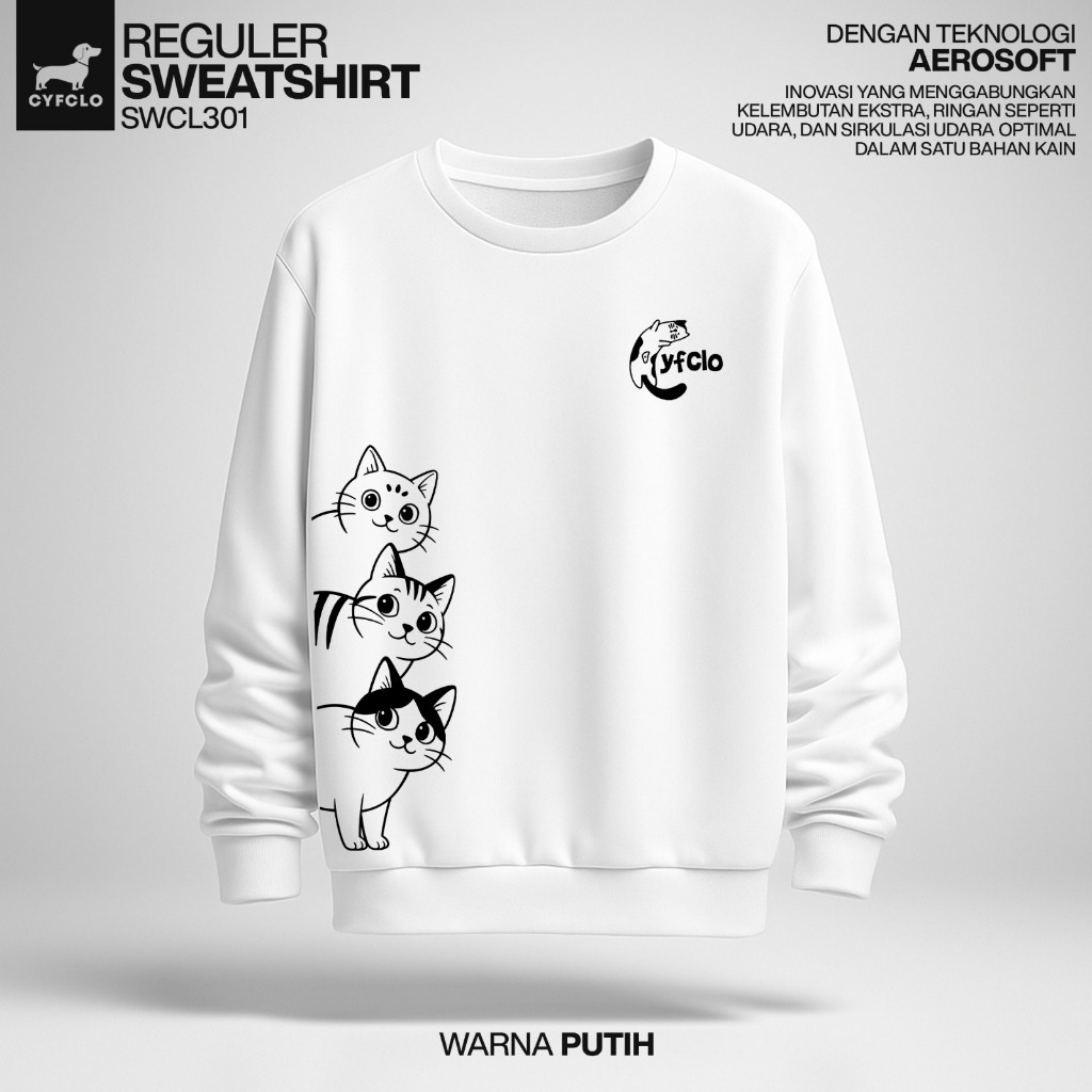 CYFCLO Sweater Jaket Tebal Sablon DTF Dengan Aerosoft Tech Motif Lucu, Crewneck Lembut Menghangatkan | SWCL301-Peek Cat