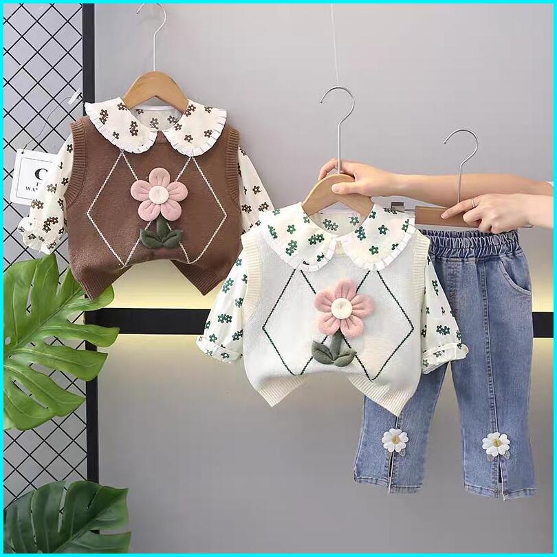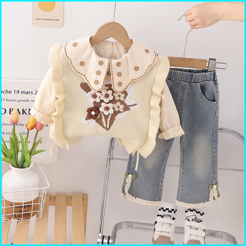 Kf Cat Setelan Anak Perempuan Lengan Panjang Bahan Rajut Soft Jeans Motif Bunga Usia 1-4 Tahun