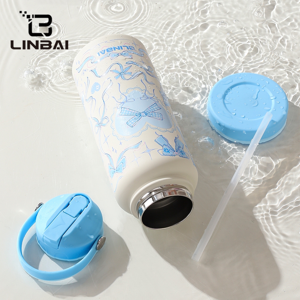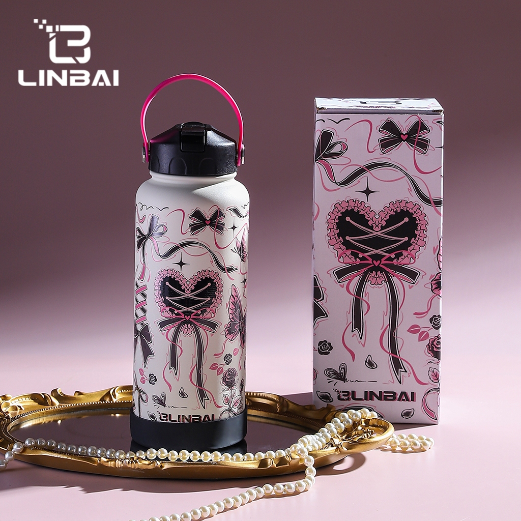 Housebrand tumbler LINBAI Flask Pink Butterfly 32oz Stainless Steel Thermos Cup Water Bottle with Straw and Boot Cup Hot
