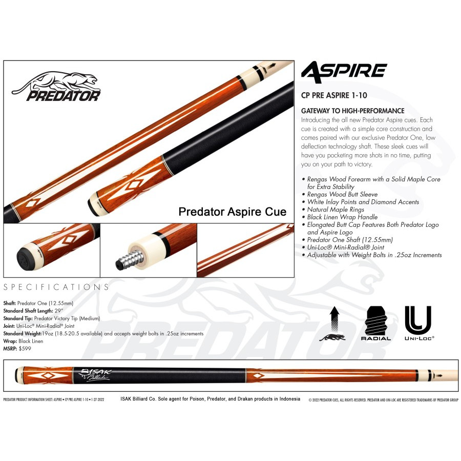 Predator Aspire 1-10 Pool Cue | Low Deflection Radial Stick Billiard - With One Shaft