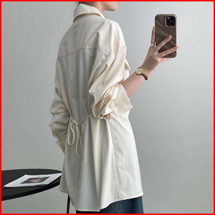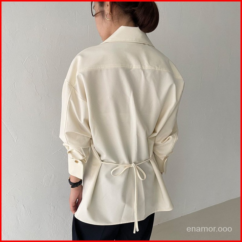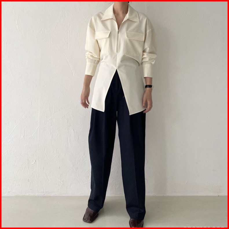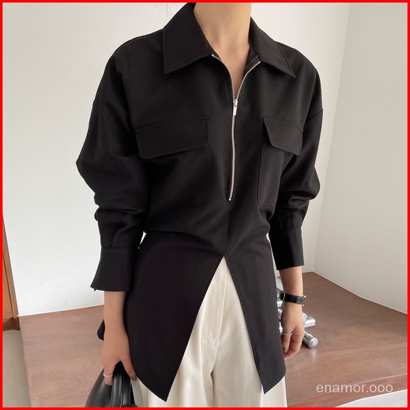 Ready Enamor Desain Ritsleting Kerah Temperamen Minimalist Saku Ganda Kembali Renda Celah Kemeja Wanita