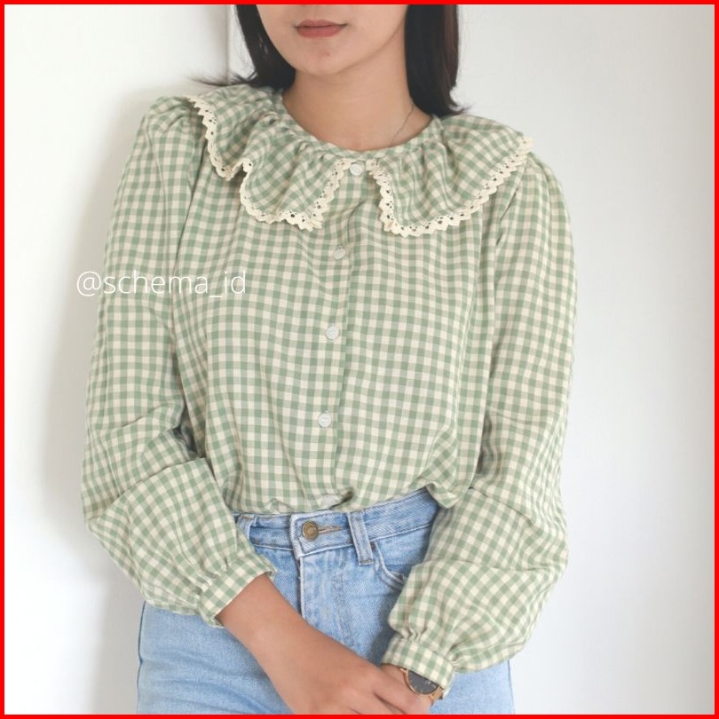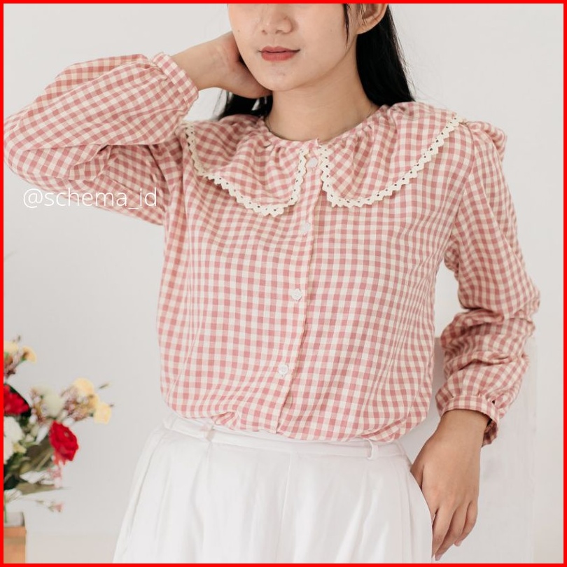 Schema Yeora Blouse Korean Style Collar Blouse Atasan Wanita Lengan Panjang Tartan Cotton Premium