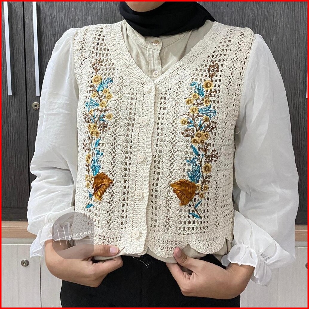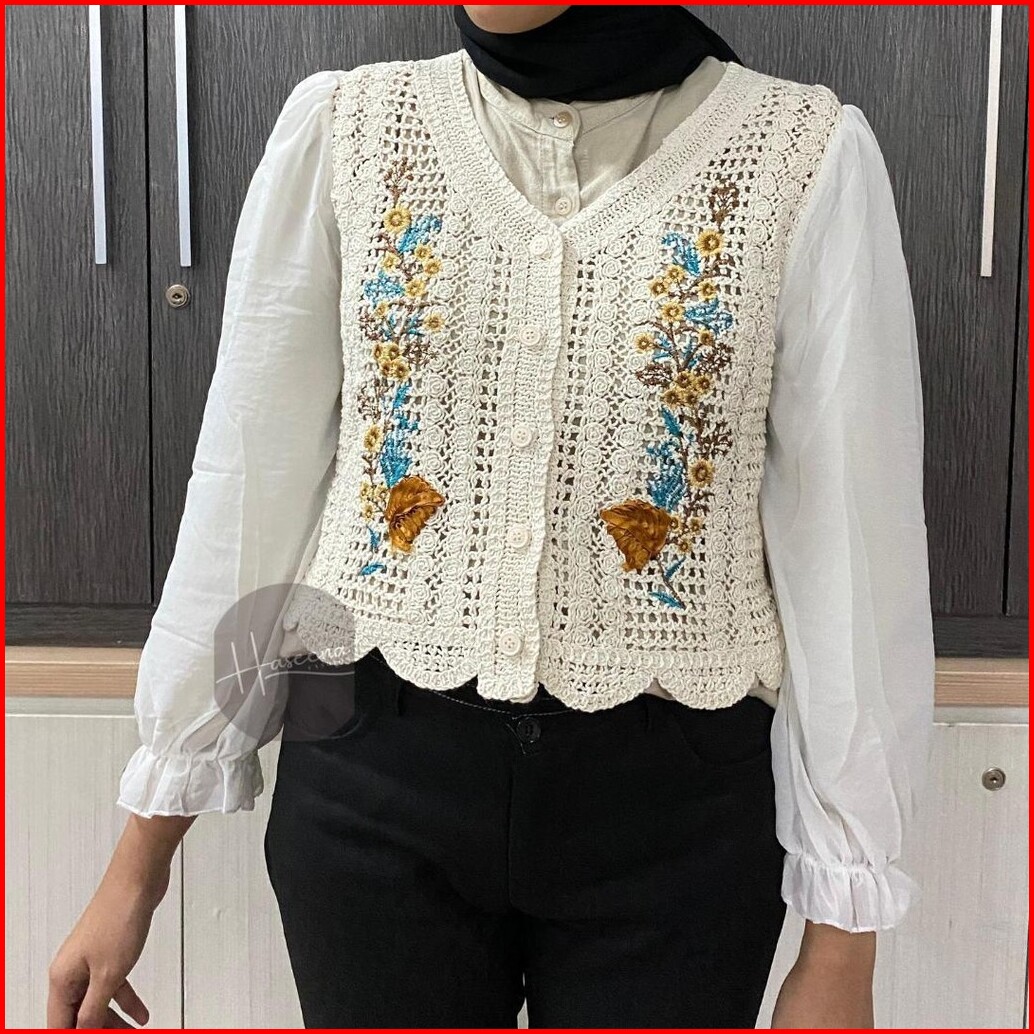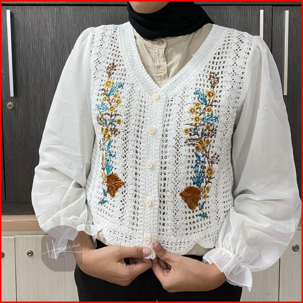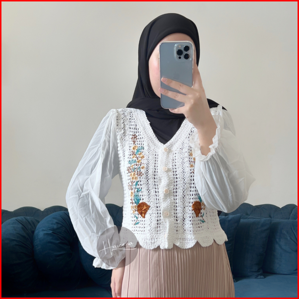 Haseena Outer Rajut Wanita Izhna Motif Bunga Timbul Lengan Panjang Chifon Cerutty Puffy Blouse Long Sleeve Atasan Vest R