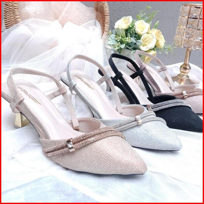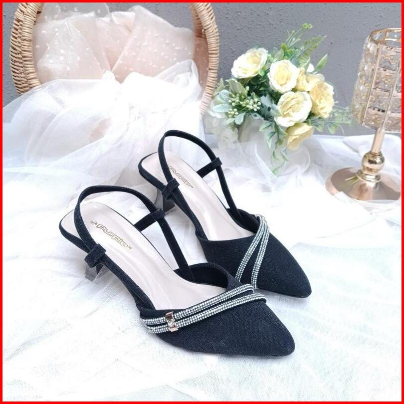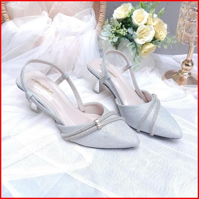 Purple Shoes - Melody Sling Back High Heels Pesta Wanita Hak Lancip 7 Cm Silver Salem Hitam