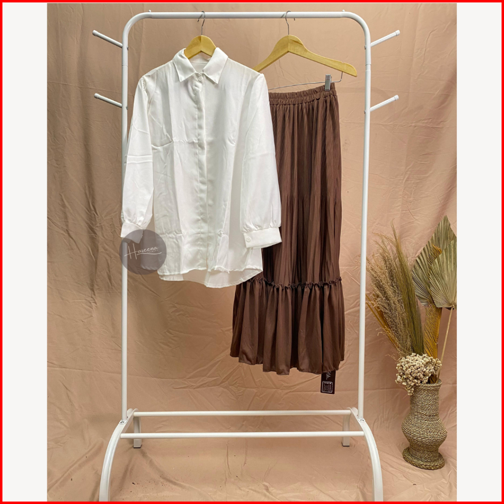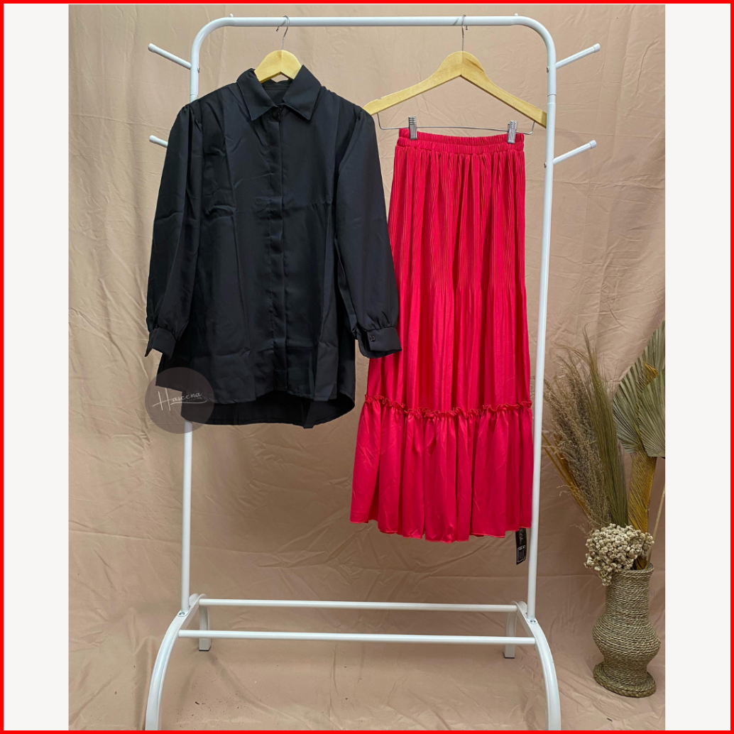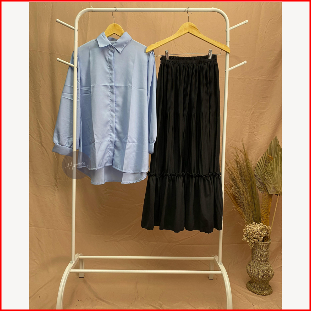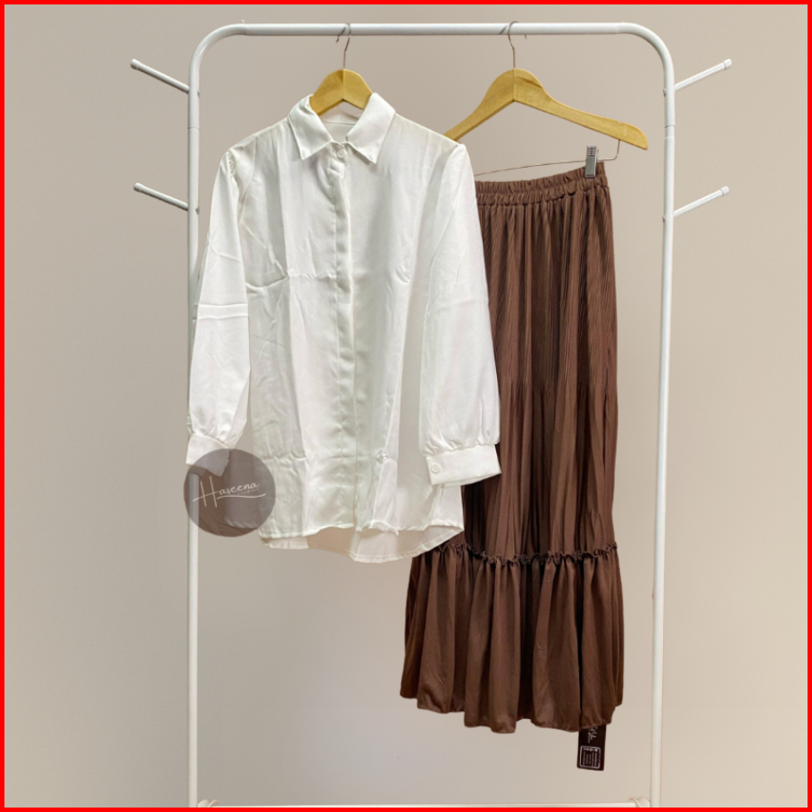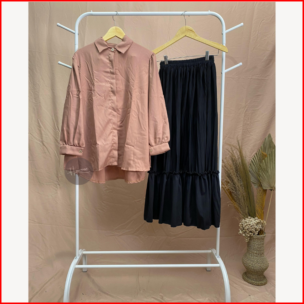 Haseena One Set Wanita Farida Setelan Atasan Kemeja Lengan Panjang Oversize Rok Plisket Maiza Rempel Polos Oneset Blouse
