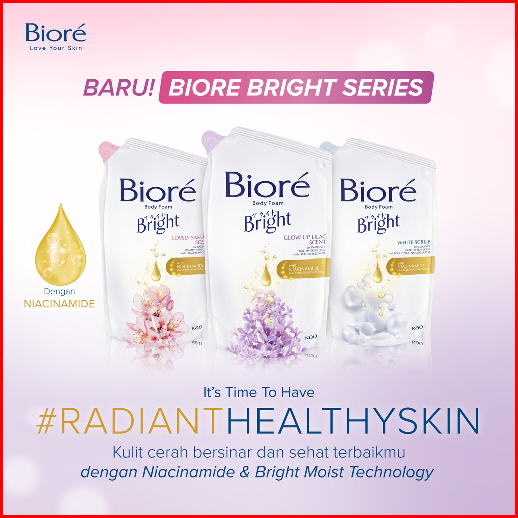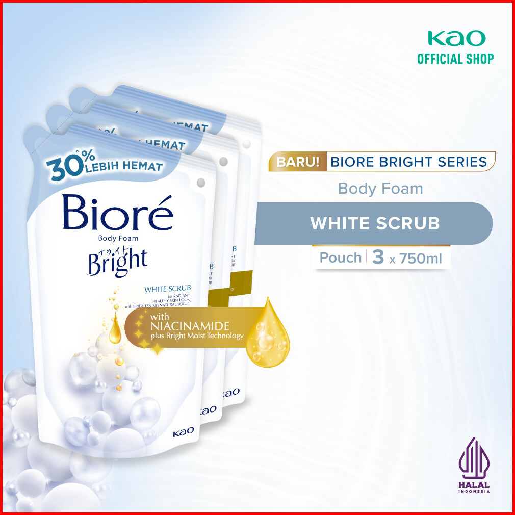 Biore Bright Body Foam Sabun Mandi Cair White Scrub Dengan Niacinamide Vit E 750ml Triple Pack