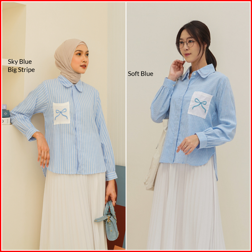 Nissa Bow Embroidery Pocket Stripe Top Full Cotton Kantong Bordir Pita Kemeja Salur Atasan Katun Wanita 2987