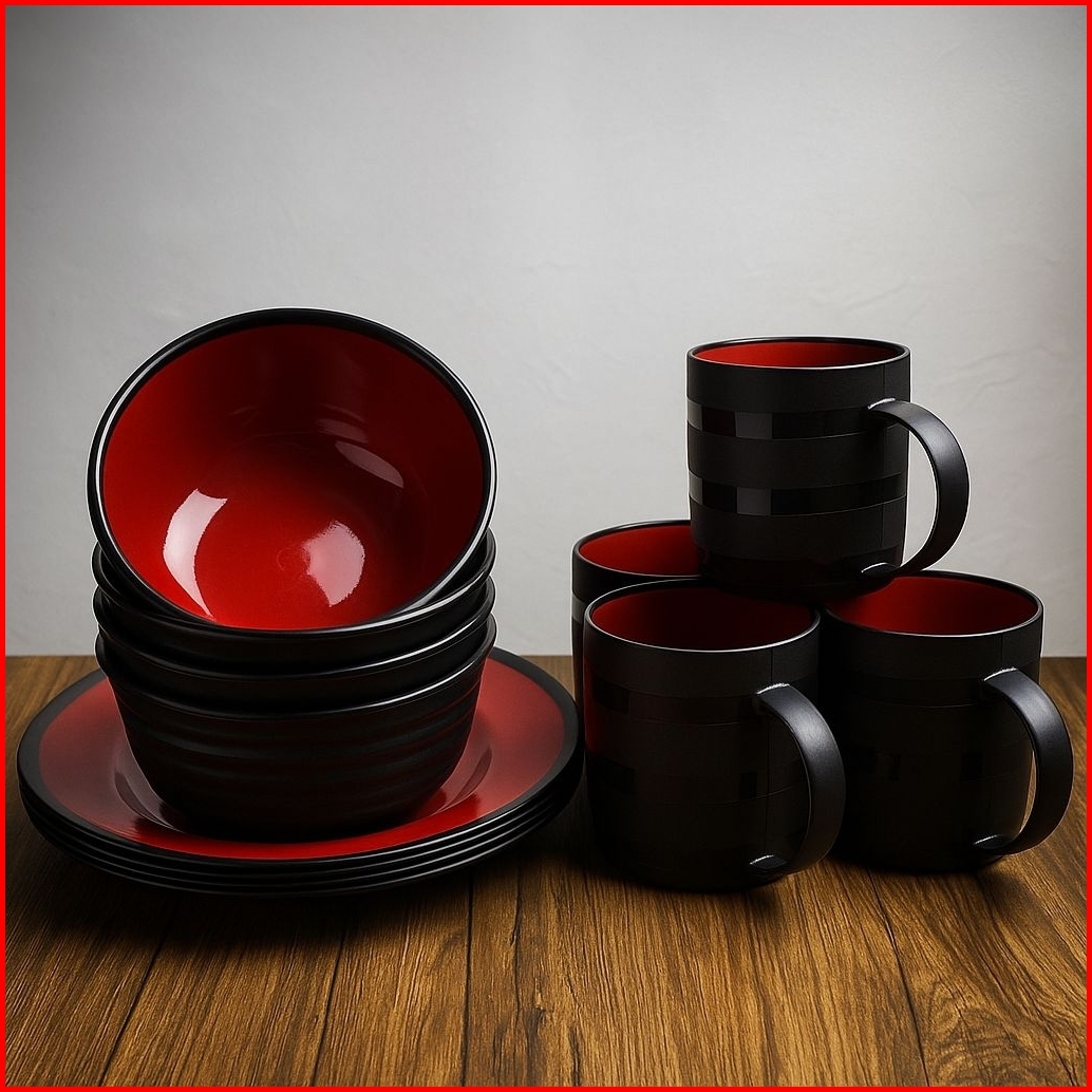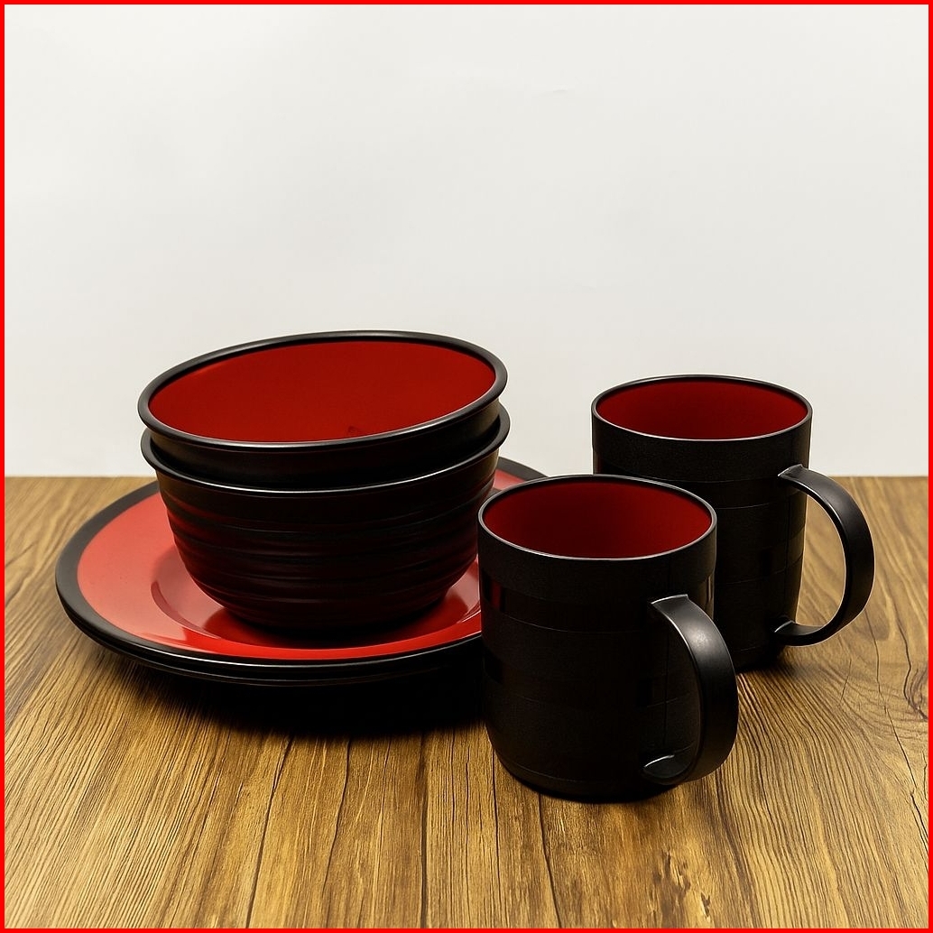 Set Mangkuk Piring Gelas Ramen Hitam Merah Anti Pecah 12 Pcs 6pcs