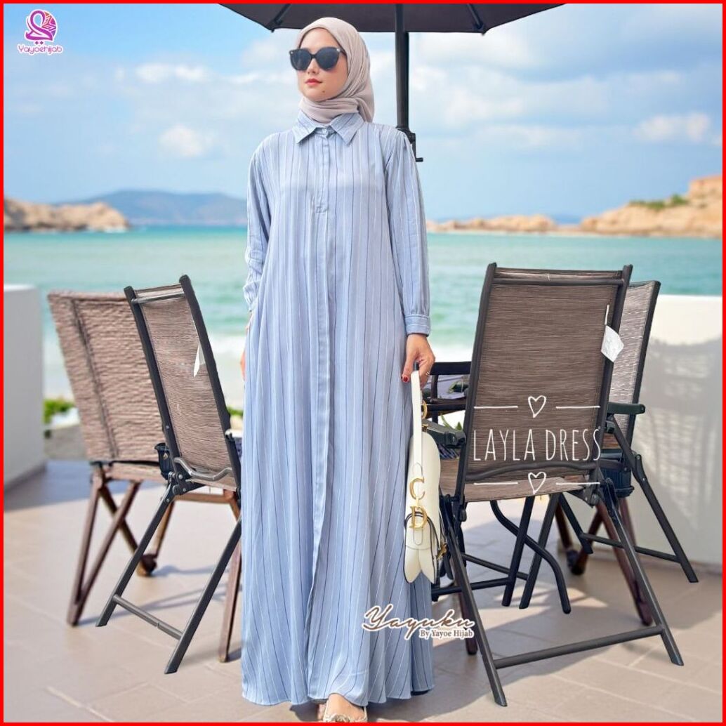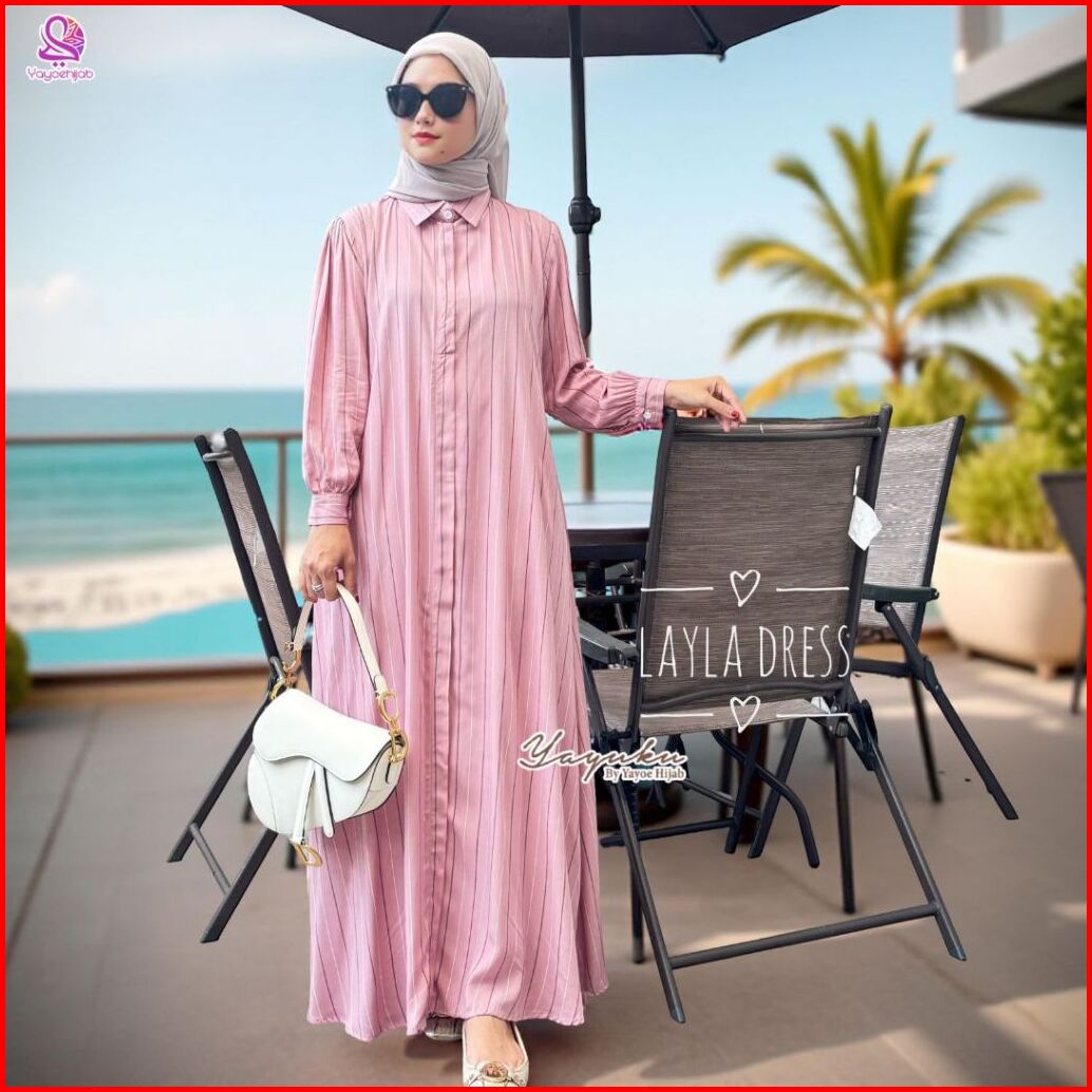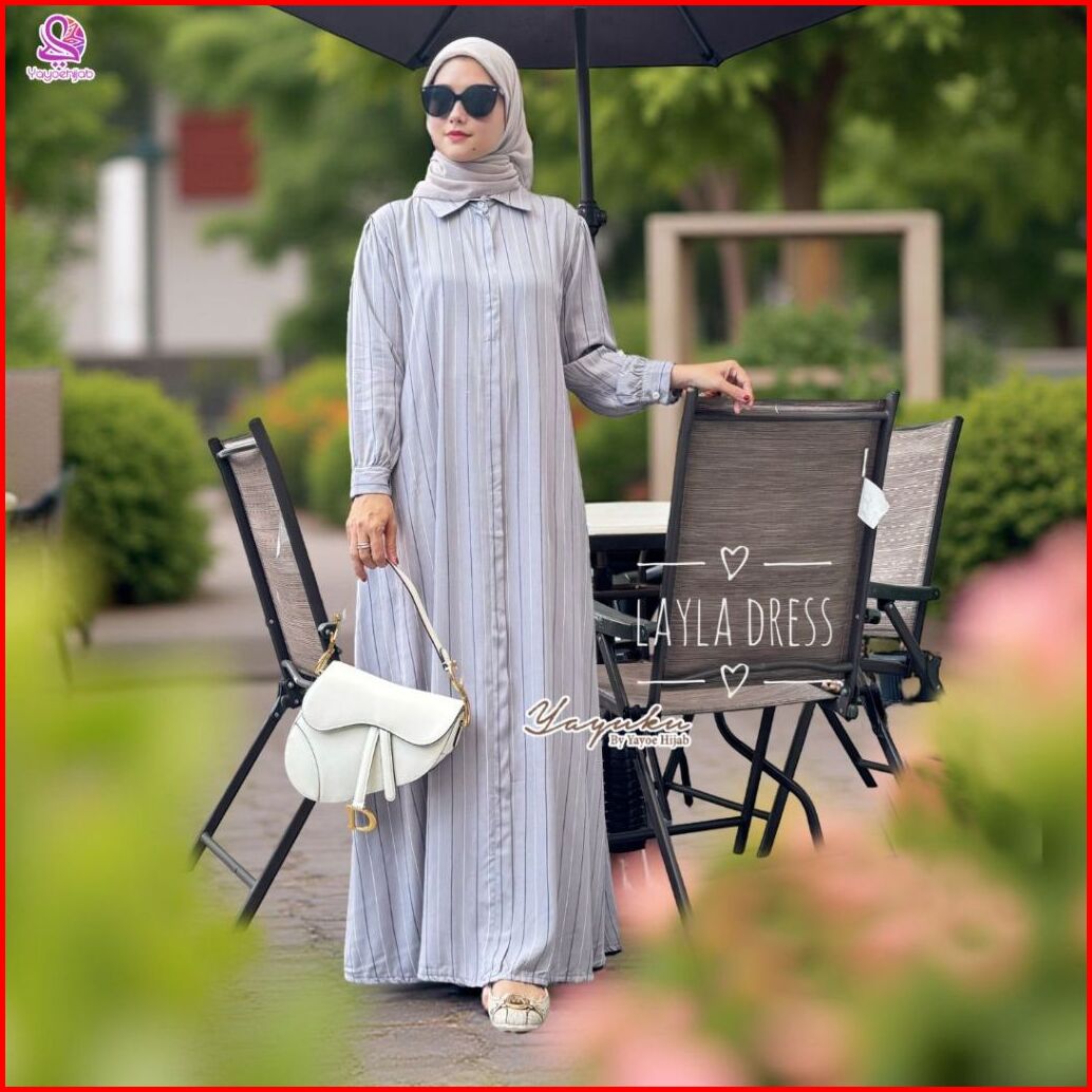 Layla Dress Panjang Garis Wanita Modis Look Simple Classy Gamis Kemeja Elegan Bahan Adem Premium Muslimah Casual Yayuku