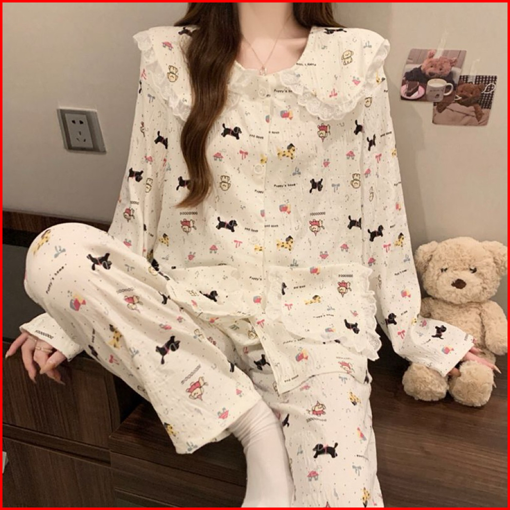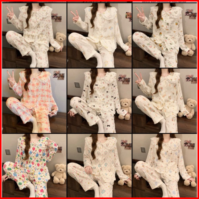 Yaplie Klaca02 Piyama Korea Baju Tidur Wanita Katun Crinkle Lengan Panjang Celana Panjang Premium