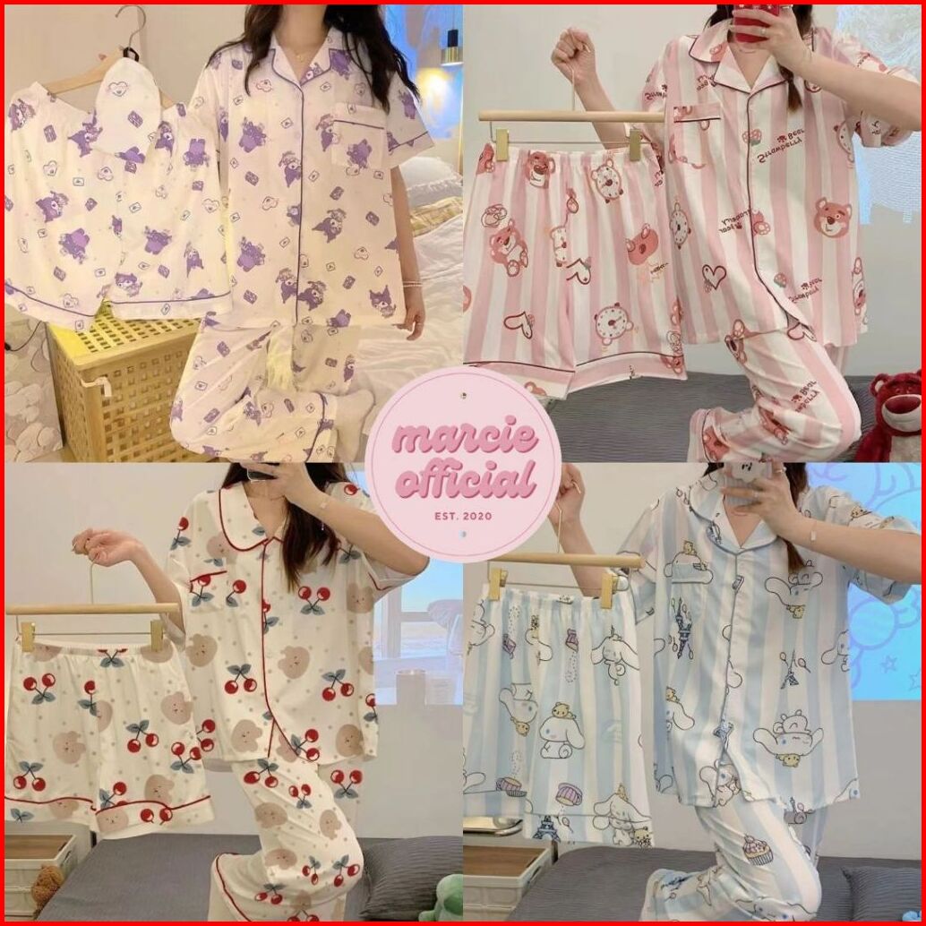 Piyama Wanita Dewasa 3 In 1 Setelan Baju Tidur Wanita Import Baju Tidur Lengan Pendek Celana Panjang Celana Pendek Bahan