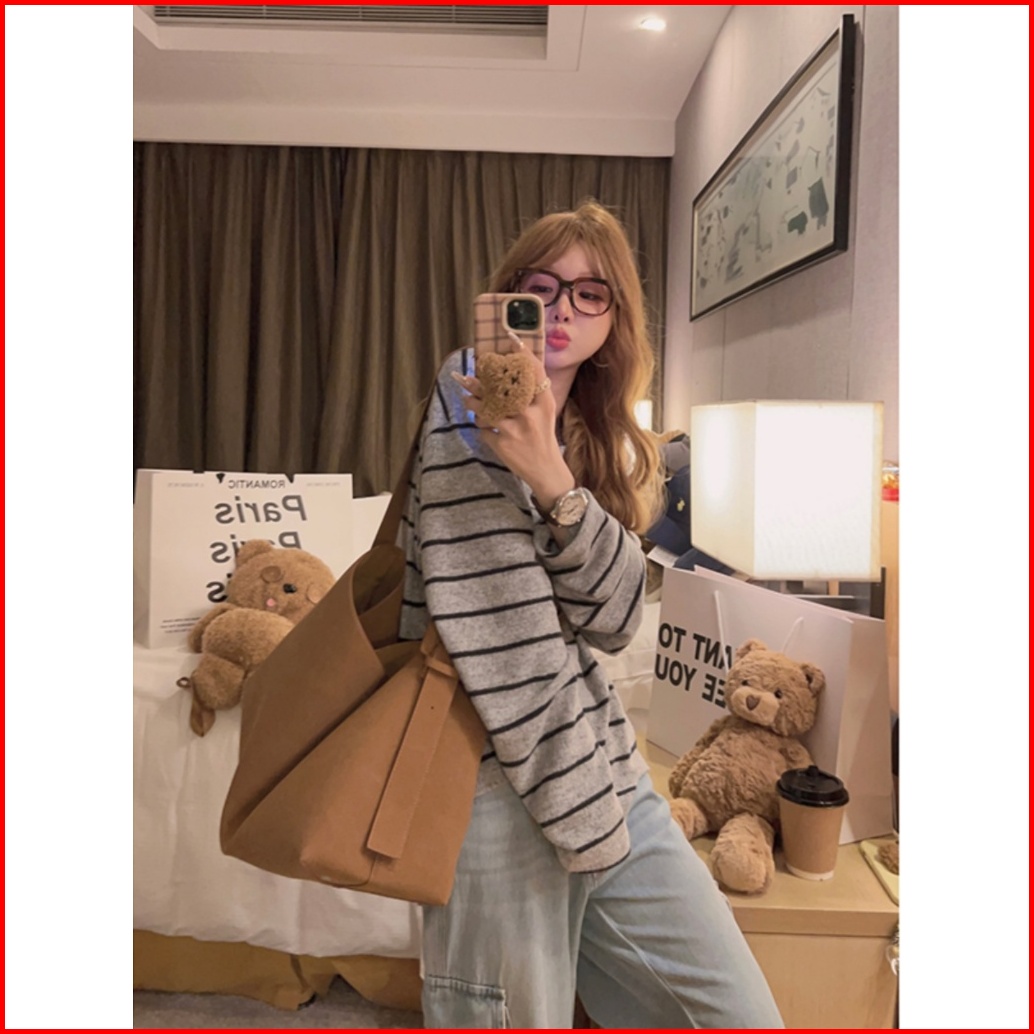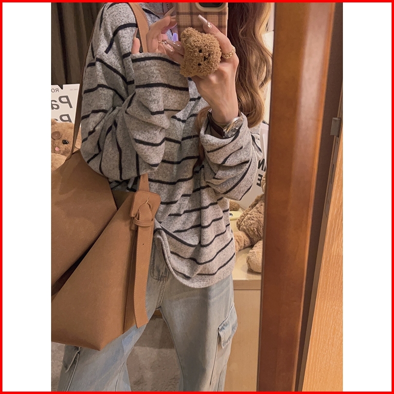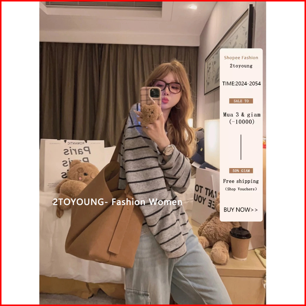2toyoung Kaos Wanita Lengan Panjang Bergaris Korea - Abu-abu Muda