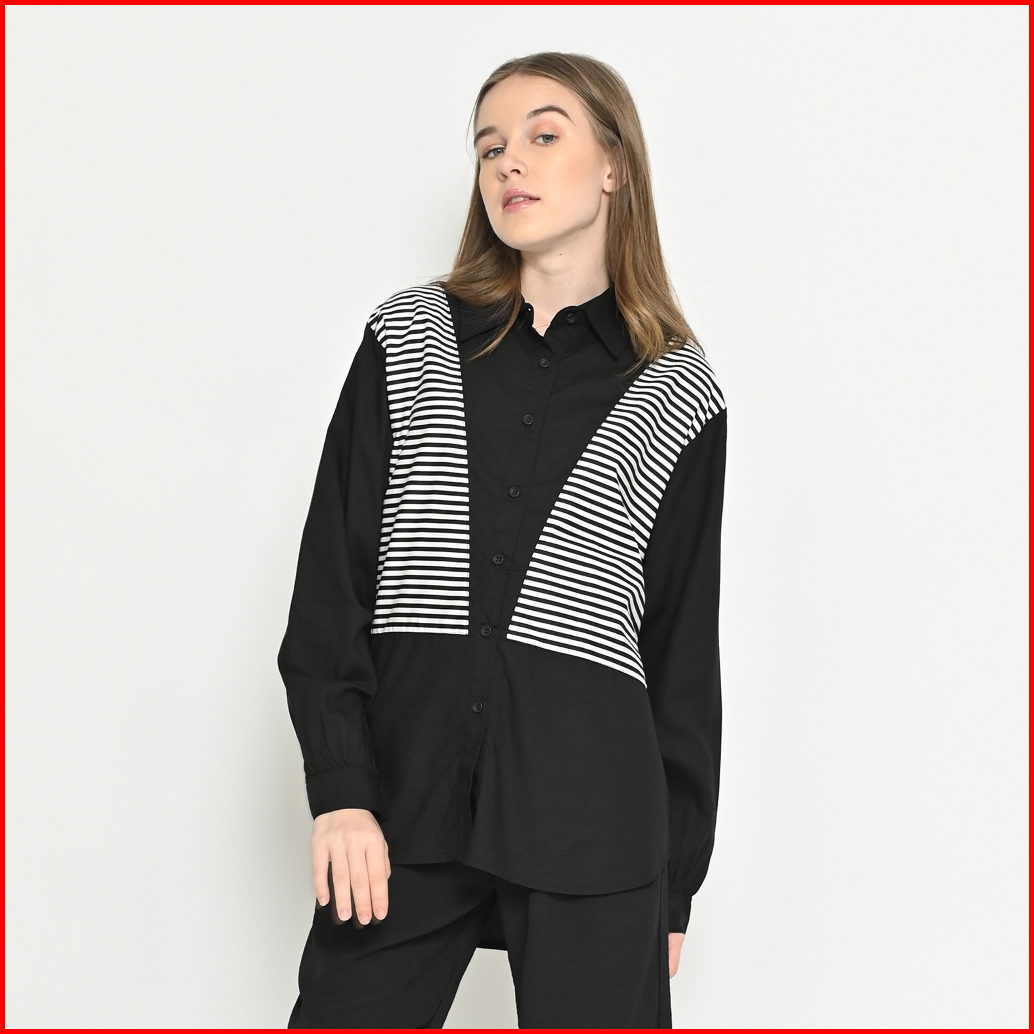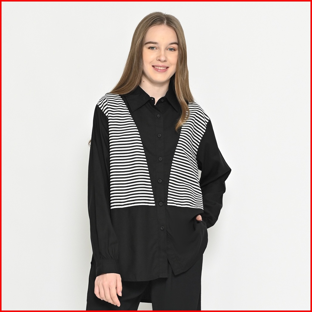 Queentin Kemeja Casual Wanita 0505 Katun Primacool Polos Kombinasi Stripe Premium Lengan Panjang